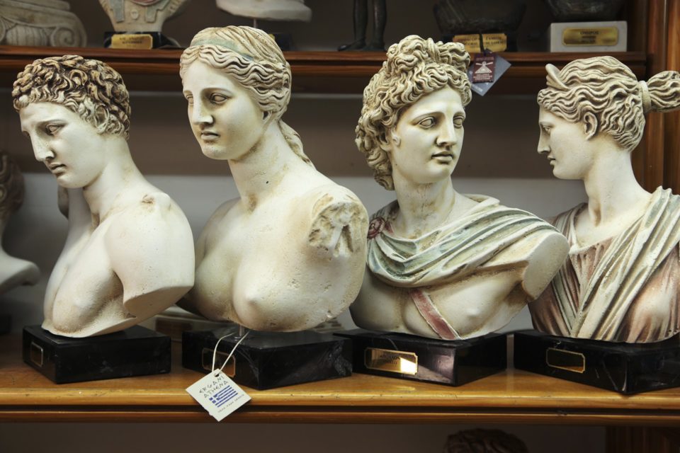 Στον ίδιο δρόμο τα τελευταία οχτώ χρόνια λειτουργεί ένα μαγαζί χωρίς όνομα που έχει μέσα όλη την αρχαία Ελλάδα: μυθικά πρόσωπα, φιλοσόφους, ναούς και θεούς σε διάφορα μεγέθη. Μπαίνουμε στο κατάστημα την ώρα που η πωλήτρια εξηγεί σε δύο Ελληνοαμερικανούς τον μύθο που στολίζει ένα πιάτο, σχετικά με την στενή πολιορκία της Δάφνης από τον θεό Απόλλωνα. Το ερωτικό ενδιαφέρον δεν ήταν αμφίδρομο και στην προσπάθειά της να τον αποφύγει, η νύμφη μεταμορφώθηκε στο γνωστό αρωματικό φυτό. Όσοι ψωνίζουν στον αριθμό 31, εκτός από να ακούνε αρχαιοελληνικούς μύθους, «επιλέγουν τον Παρθενώνα και την θέα Αθηνά, ξέρουν ποια πρόσωπα της ιστορίας τους ενδιαφέρουν κι έρχονται ενημερωμένοι». Συνήθως θέλουν να αγοράσουν κάτι φθηνό, όπως ένα πιάτο που απεικονίζει την θεά Άρτεμις, την Αθηνά και τον Ποσειδώνα ταυτόχρονα (για 3,50 ευρώ). Αγάλματα μεσαίου μεγέθους έχουν μέσο όρο τιμής τα 20 ευρώ, η τιμή ανεβαίνει για τα ογκώδη μαρμάρινα κρεμαστά διακοσμητικά τοίχου που μπορεί να κοστίζουν από 70 έως 100 ευρώ.