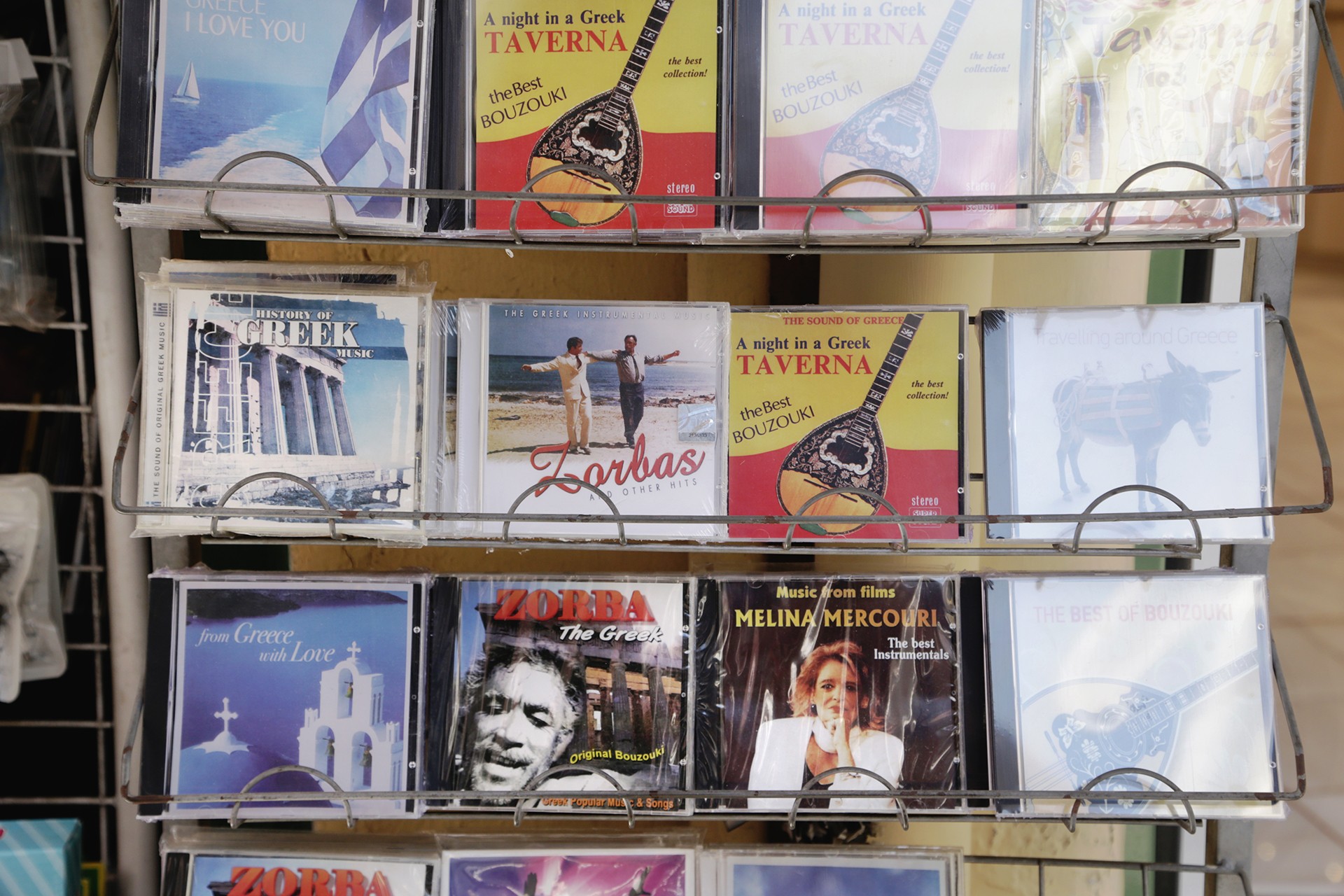 Σε τουριστικό δισκοπωλείο, και με μια ματιά στο ράφι με «τα δημοφιλή», φαίνεται πως εξάγουμε πολύ Μίκη Θεοδωράκη, Ντέμη Ρούσσο, Μελίνα Μερκούρη, Yanni και Νανά Μούσχουρη. Best seller χωρίς αμφιβολία είναι το σάουντρακ Zorba The Greek, κοστίζει 10 ευρώ κι έχει δώσει το όνομά του στο σχετικό κατάστημα της Αδριανού. Στο ίδιο σημείο ευπώλητο είναι το μπαγλαμαδάκι, αν και «πολλοί πελάτες θα επέλεγαν το μπουζούκι που όμως δεν χωράει στη βαλίτσα τους», σύμφωνα με την Αμαλία που εργάζεται εκεί.