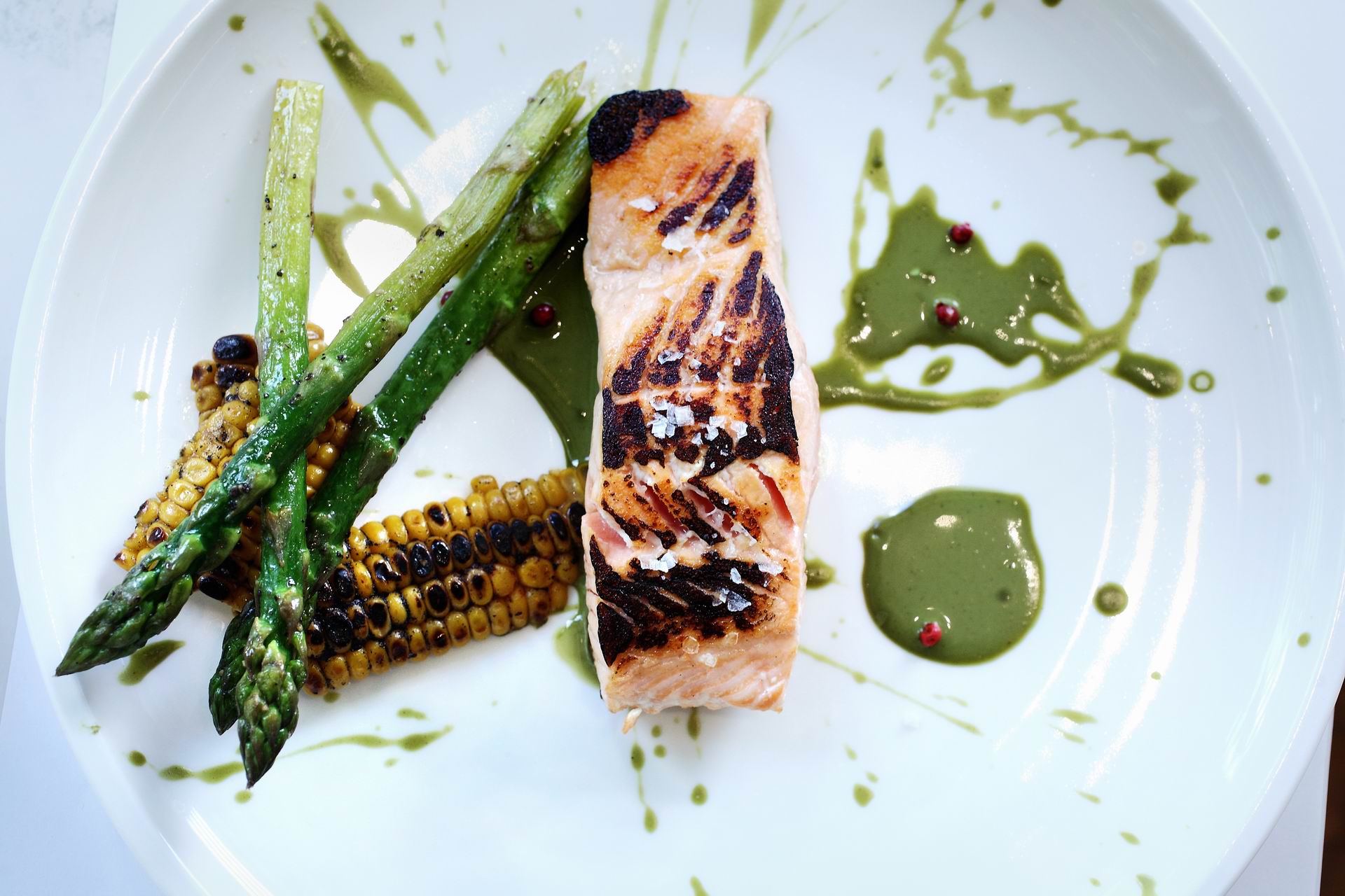 Ψητός σολομός με βούτυρο από φιστίκι Αιγίνης, σπαράγγια και καλαμπόκι