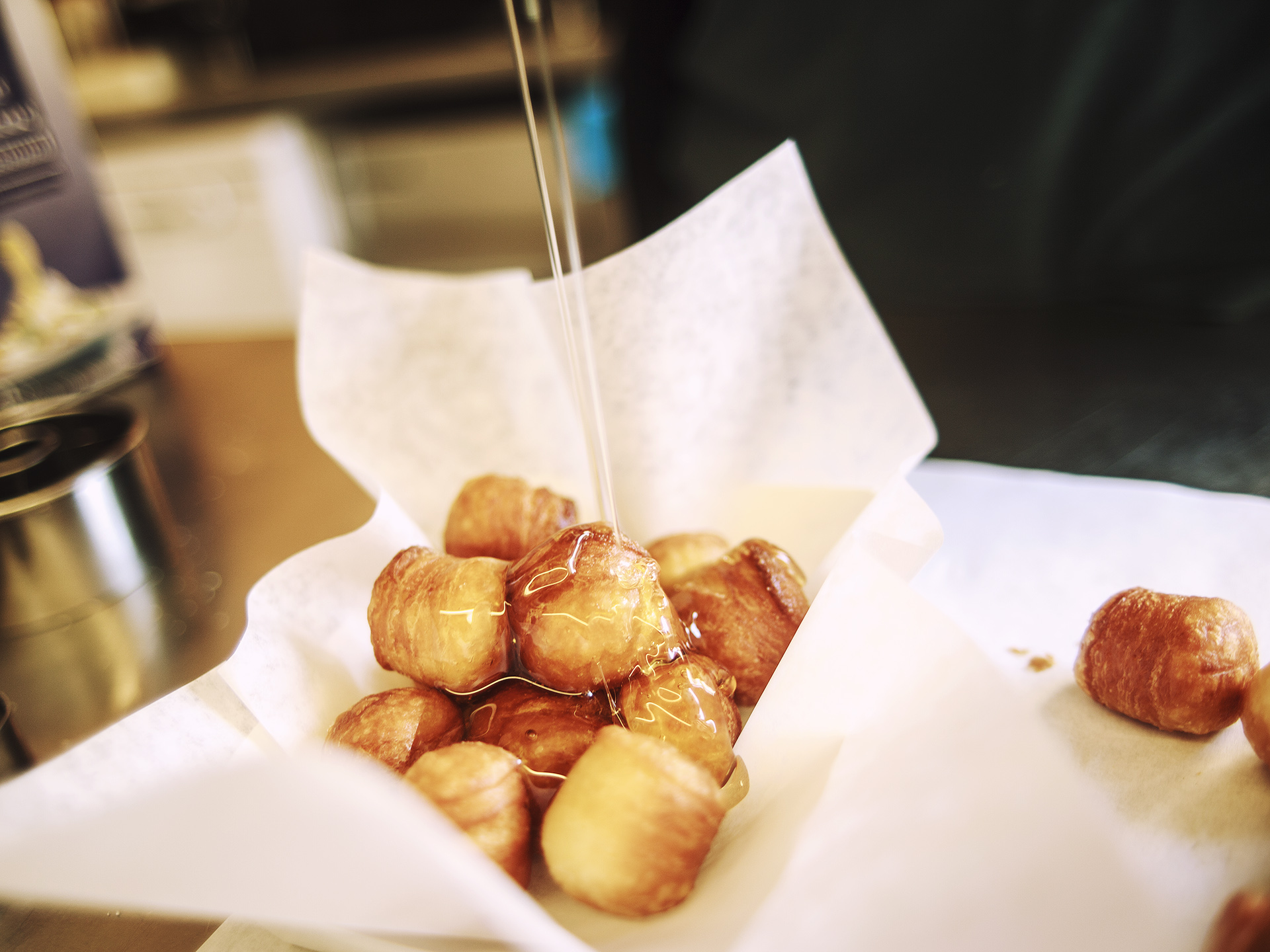 Τα φρουτώδη σιρόπια που θα δείτε στον μικρό και πεντακάθαρο πάγκο τους φτιάχνονται από τους ίδιους. Και δεν έχουν συνηθισμένες προτάσεις. Μπορείτε να λούσετε τους λουκουμάδες ή το κρόνατ σας (από 2,70 ευρώ) με σιρόπι σμέουρο, αλατισμένης καραμέλας, με μάνγκο, με φράουλα, με σιρόπι αγαύης και σφενδάμου. Μια πολύ νόστιμη πρότασή τους είναι το κρόνατ με τυρί και μέλι, με γραβιέρα Αμφιλοχίας, με μοτσαρέλα βουβαλίσια, camembert ή ξινομυζήθρα Κρήτης.