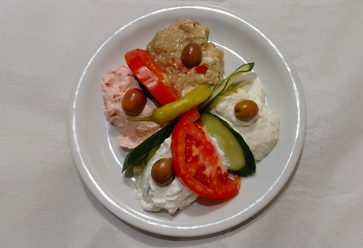 Η βραδιά ξεκίνησε με ποικιλία αλοιφών: μια μικρή συμφωνία από τυροκαυτερή, μελιτζανοσαλάτα, ταραμοσαλάτα και τζατζίκι, στολισμένη με καυτερή πιπερίτσα, ντομάτες, αγγουράκια και ελιές. Ήταν τόσο νόστιμη, που πριν καν την τελειώσουμε παραγγείλαμε και δεύτερη.