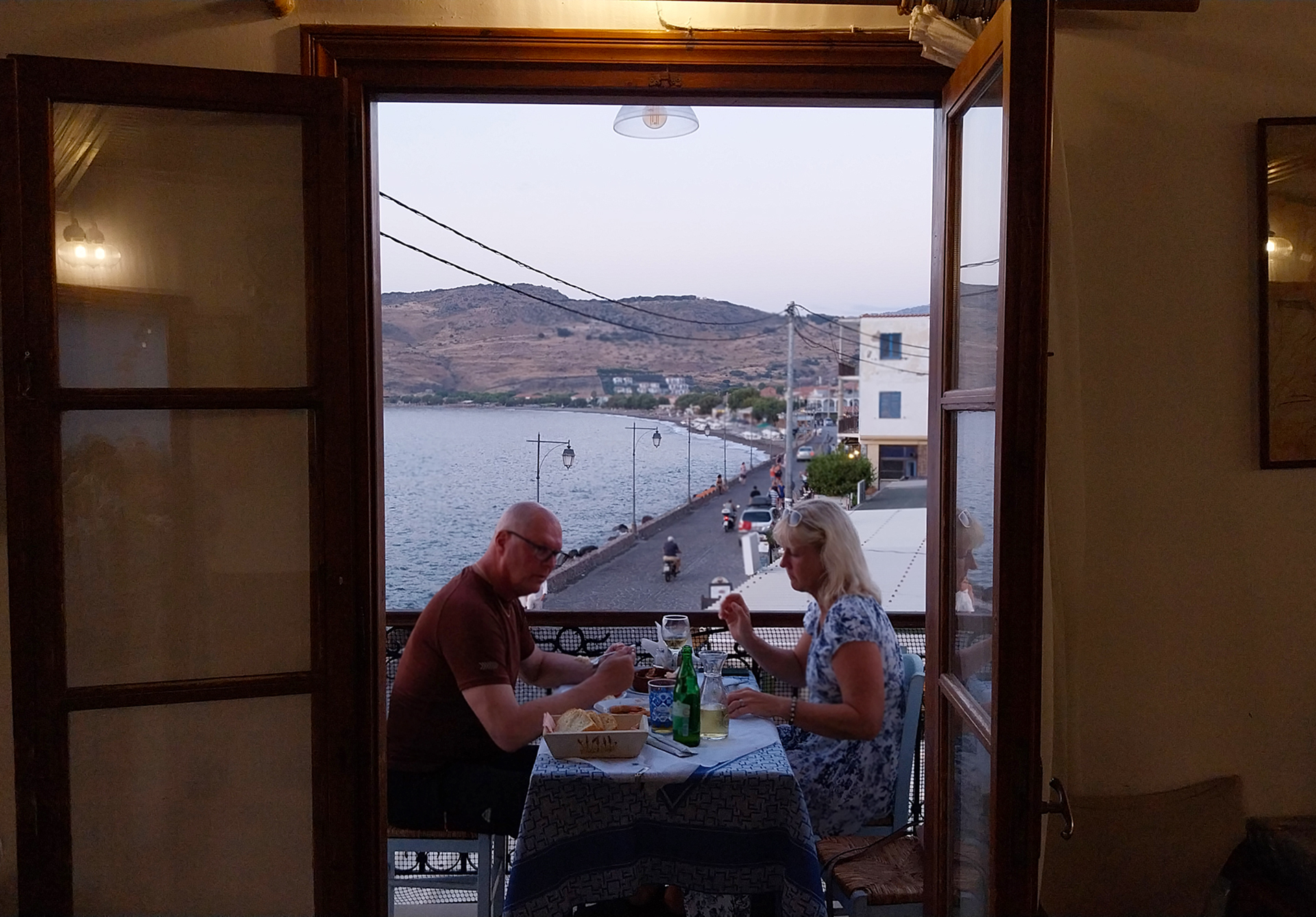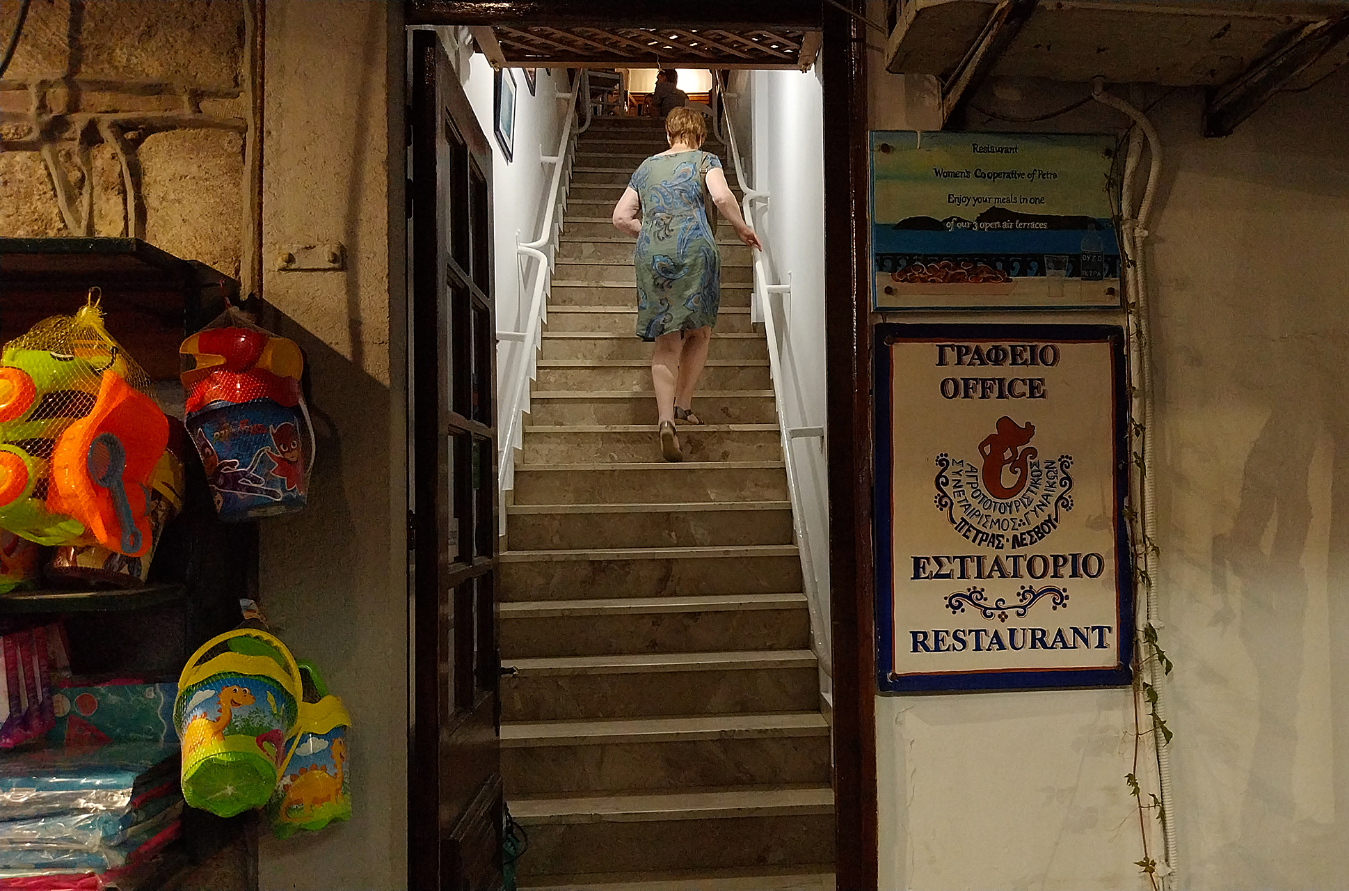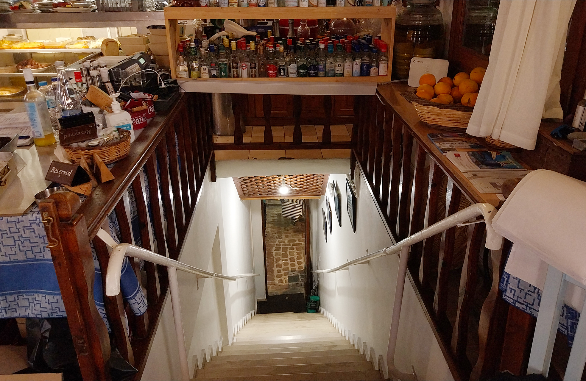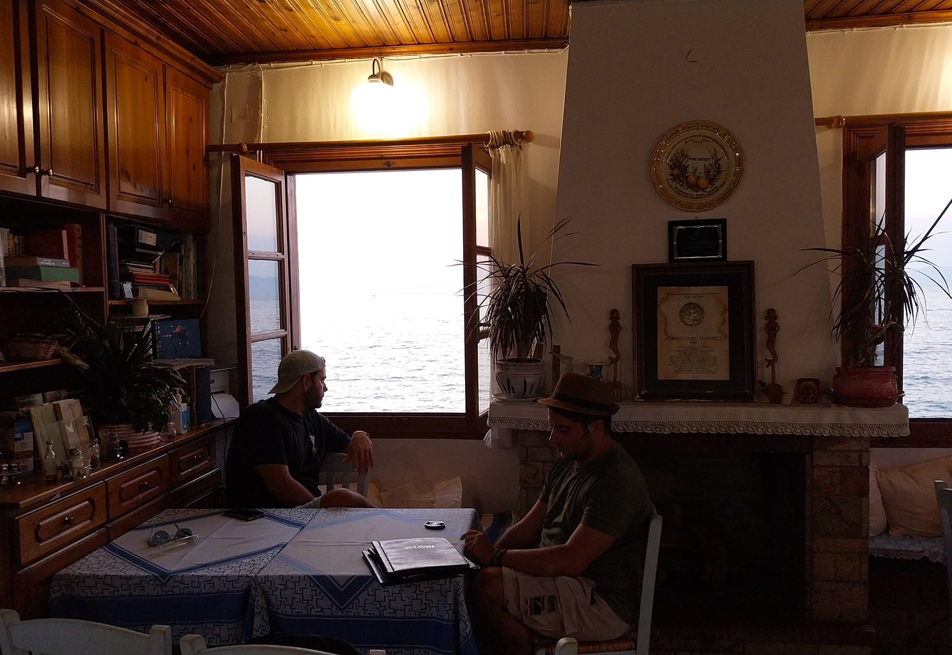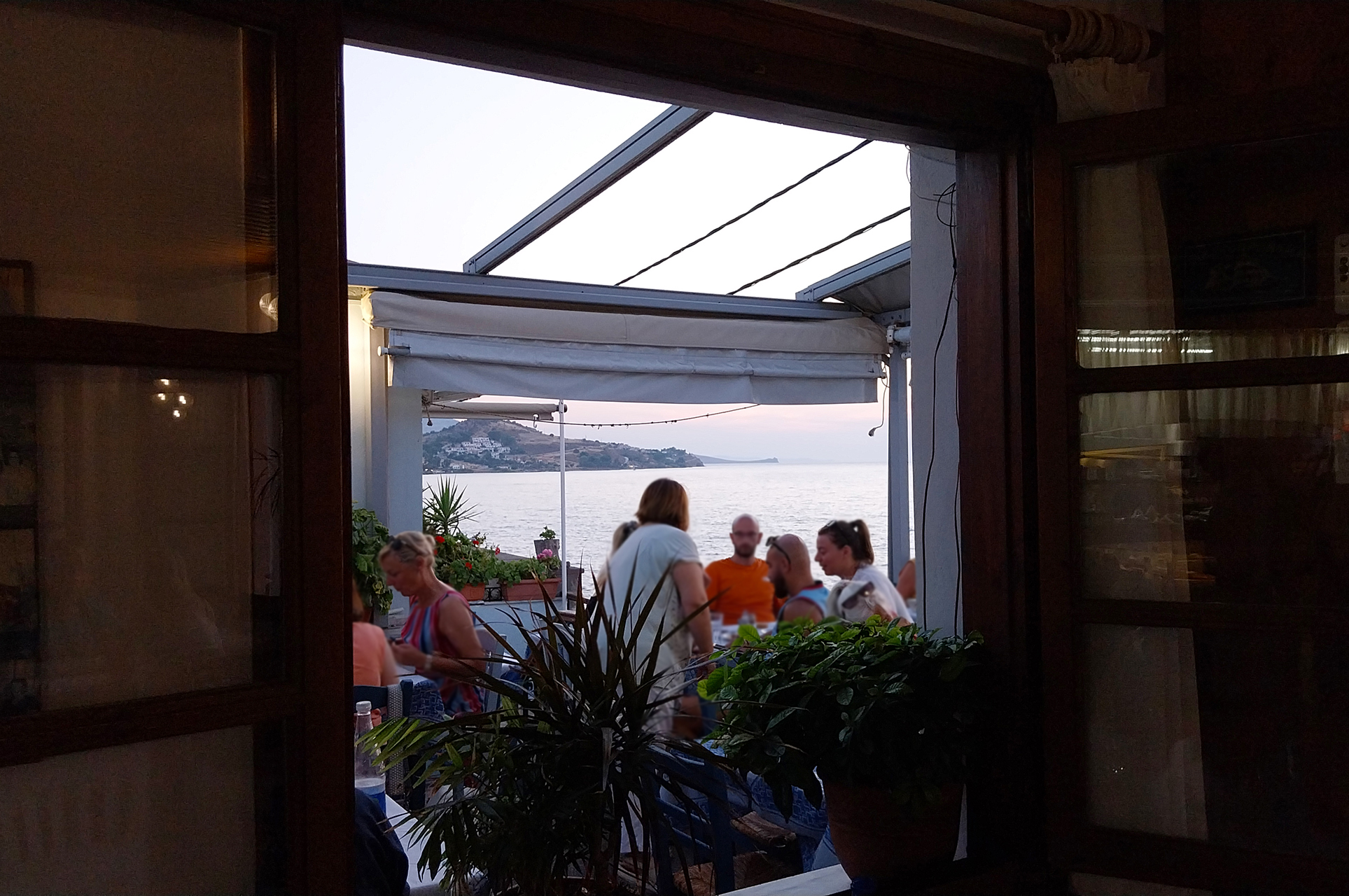 Σήμερα, αυτές οι γυναίκες (που είναι περισσότερες) δεν πλάθουν μόνο πίτες και γεμιστά. Ανεβαίνεις τη σκάλα και βρίσκεσαι σε ένα εστιατόριο απλωμένο σε όλο τον επάνω όροφο, που κοιτάζει απευθείας στο πέλαγος.