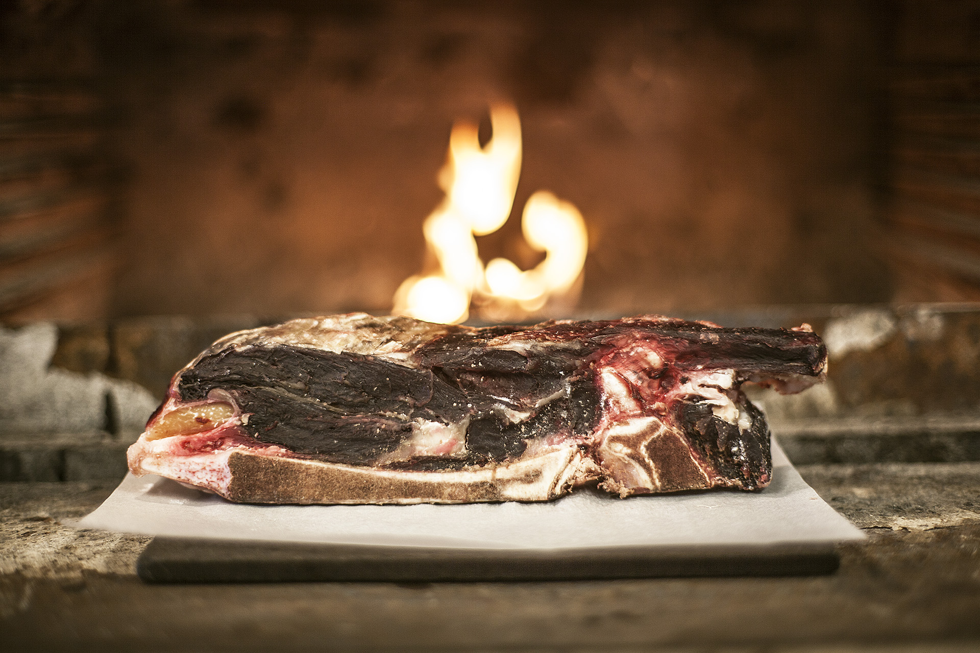 Κομμάτι από παλαιωμένο abertine angus μπροστά στη φωτιά του ξυλόφουρνου Josper