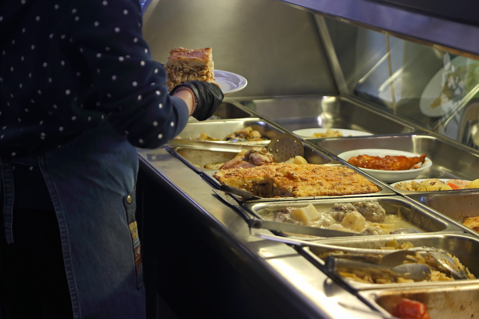 Από το 1992 μέχρι και σήμερα, τα πιάτα στην «Γειτονιά» μένουν σχεδόν ίδια. Αυτή είναι ίσως και η συνταγή της επιτυχίας τους, γι΄αυτό και οι περισσότεροι πελάτες τρώνε και ξανατρώνε τα αγαπημένα τους. Ψαρόσουπα, όσπρια, παστίτσιο και γιουβέτσι, δεν προλαβαίνουν να μείνουν για πολύ στην βιτρίνα. «Έχουμε συγκεκριμένα φαγητά, συγκεκριμένες μέρες. Οι πελάτες μας το ξέρουν και έρχονται και τα ζητάνε», λέει ο κύριος Κώστας. «Ξέρουν ότι την Παρασκευή θα φάνε λαζάνια ογκρατέν και την Τετάρτη φασολάδα». Οι πρώτες ύλες στην «Γειτονιά» προέρχονται από τα τριγύρω μαγαζιά και την λαϊκή της περιοχής, ενώ το μενού εξαρτάται από την εποχικότητα των υλικών.
