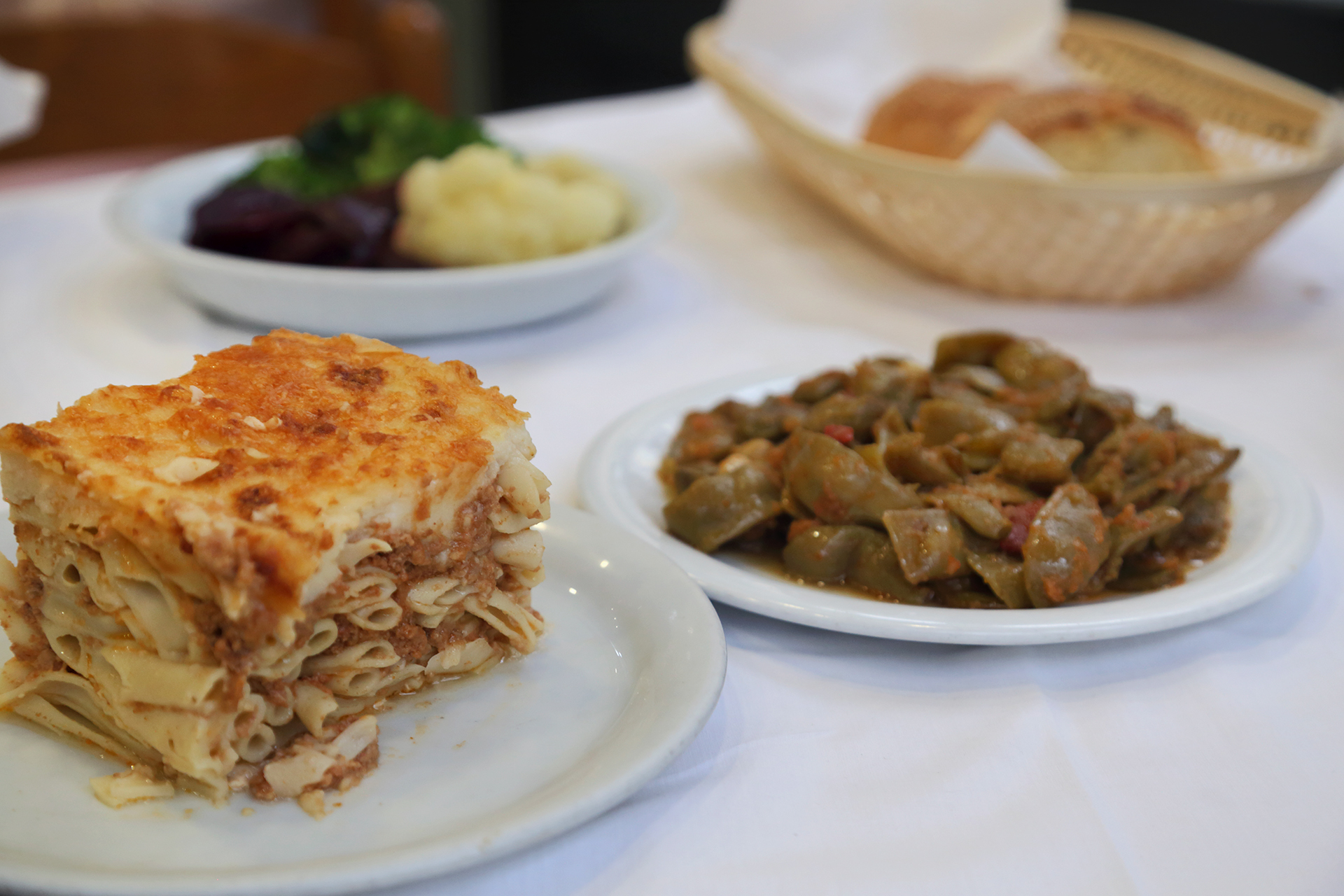 Παστίτσιο, φασολάκια και φρέσκα βραστά λαχανικά.