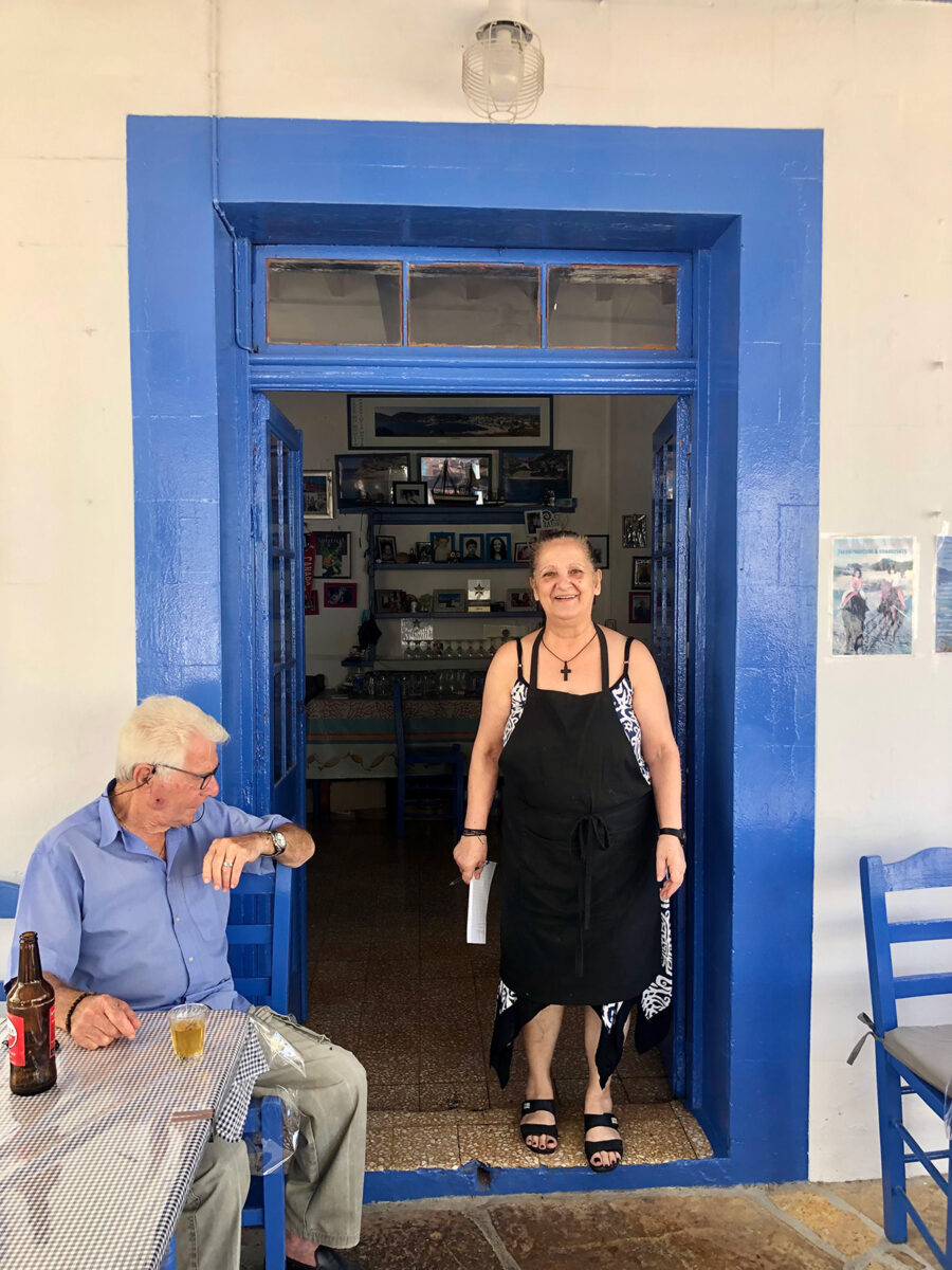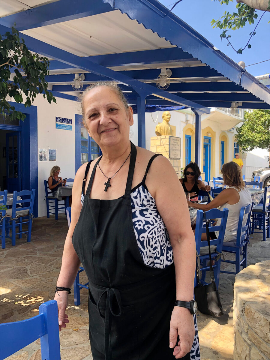 Η κυρία Δέσποινα Παντέλλου στο ταβερνάκι της, Du Moulin, στην κεντρική γραφική μινιόν πλατεία των Λειψών.