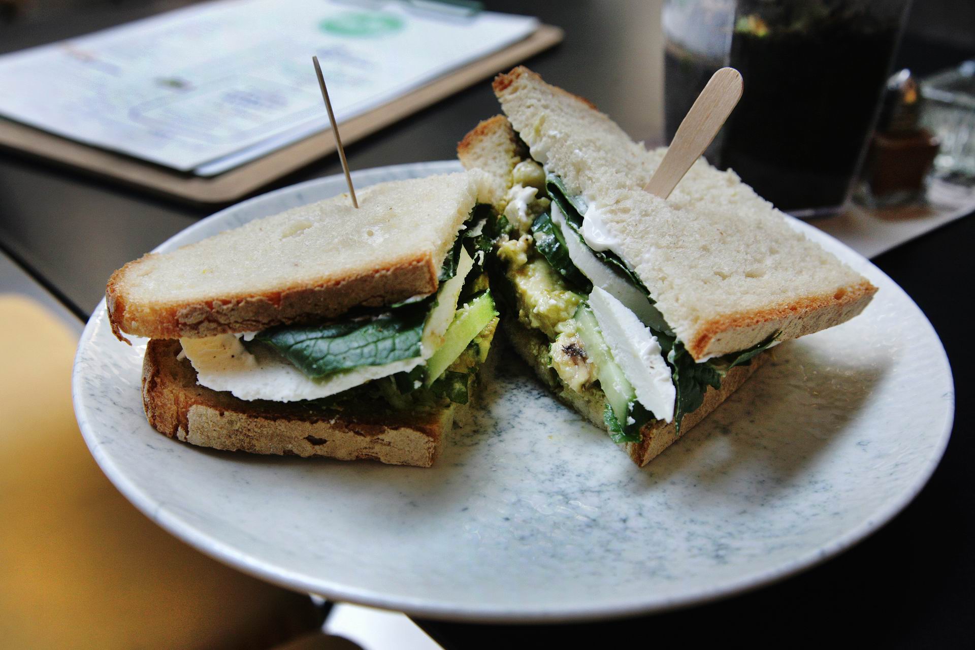 Σάντουιτς με αβοκάντο, ρόκα, αγγούρι, πέστο βασιλικό, σπανάκι και μανούρο. Σε φρέσκο λευκό ψωμί. Σε αυτούς που αρέσουν τα αλλαντικά υπάρχει η επιλογή με το ζεστή χοιρινή μπριζόλα αλλά και με τη σαρντινέλλα και το κασέρι. Θα βρείτε επίσης επιλογή και με σολομό αλλά και χωρίς κρέας για τους βετζετέριαν.