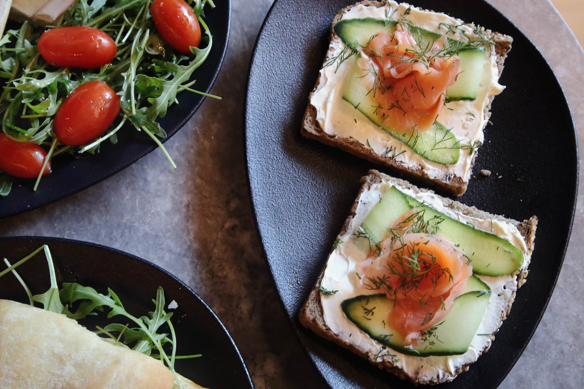 Πολύσπορο ψωμί Dinkel σε open sandwich με καπνιστό σολομό, τυρί κρέμα, αγγουρί και άνηθο.