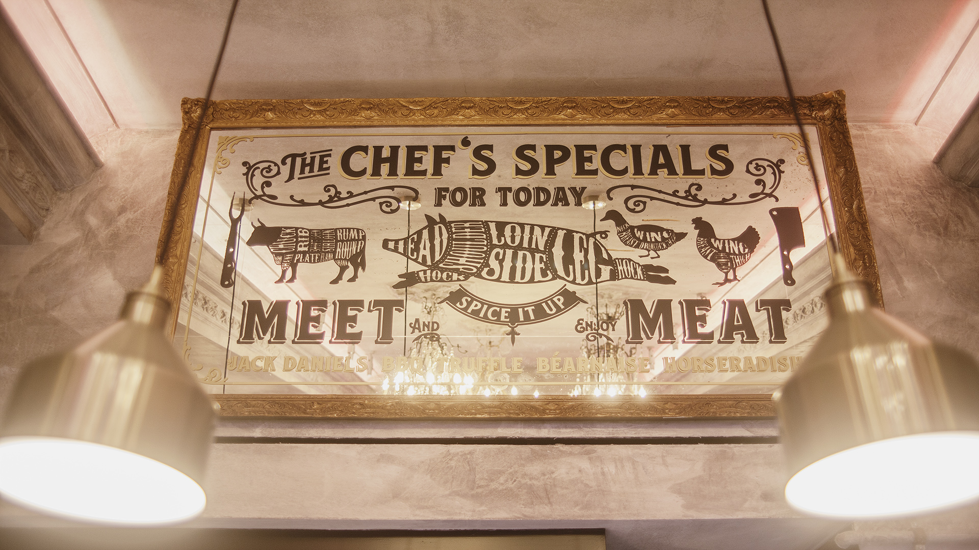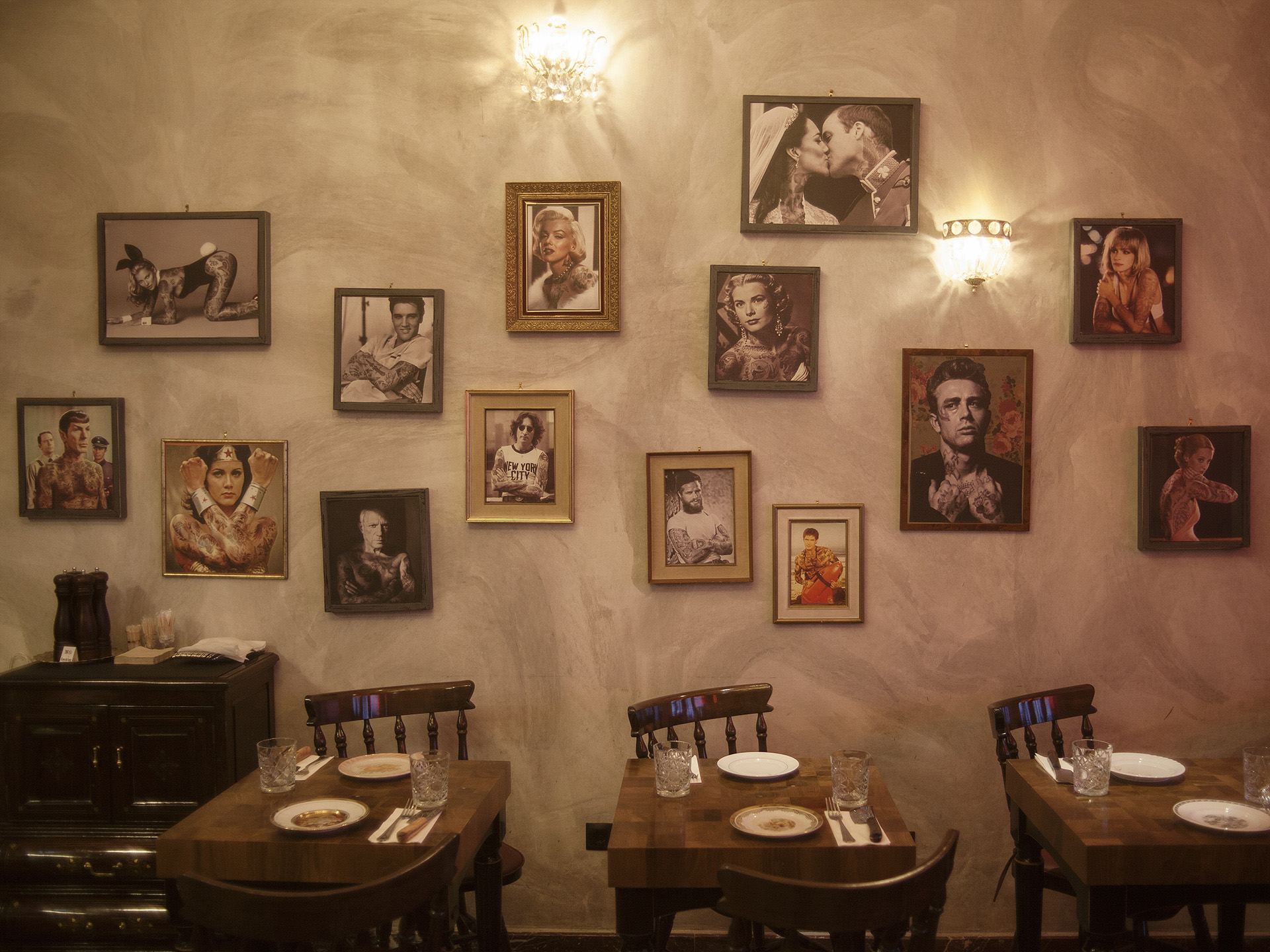 8 τραπέζια και 5 θέσεις στο μπαρ, ένας επιβλητικός πολυέλαιος κι ένας χαρακτηριστικός καθρέφτης, δεκάδες κάδρα στους τοίχους με διάσημους σταρ από τον Μάρλον Μπράντο και τον Στιβ Μακ Κουίν στη Μέριλιν και τον Έλβις να «φοράνε τατουάζ» (το design έχει επιμεληθεί ο Γιώργος Παντελούκας), οι σούβλες στο βάθος σε πρώτο πλάνο. Κι ένα μενού με 2 σελίδες μπρος-πίσω που επιμελήθηκε ο Μιχάλης Μερζένης (the Cellar Athens, Dry and Raw, Fresh Mykonos) που τον τρόπο του με τα κρέατα τον (παρα)έχει.