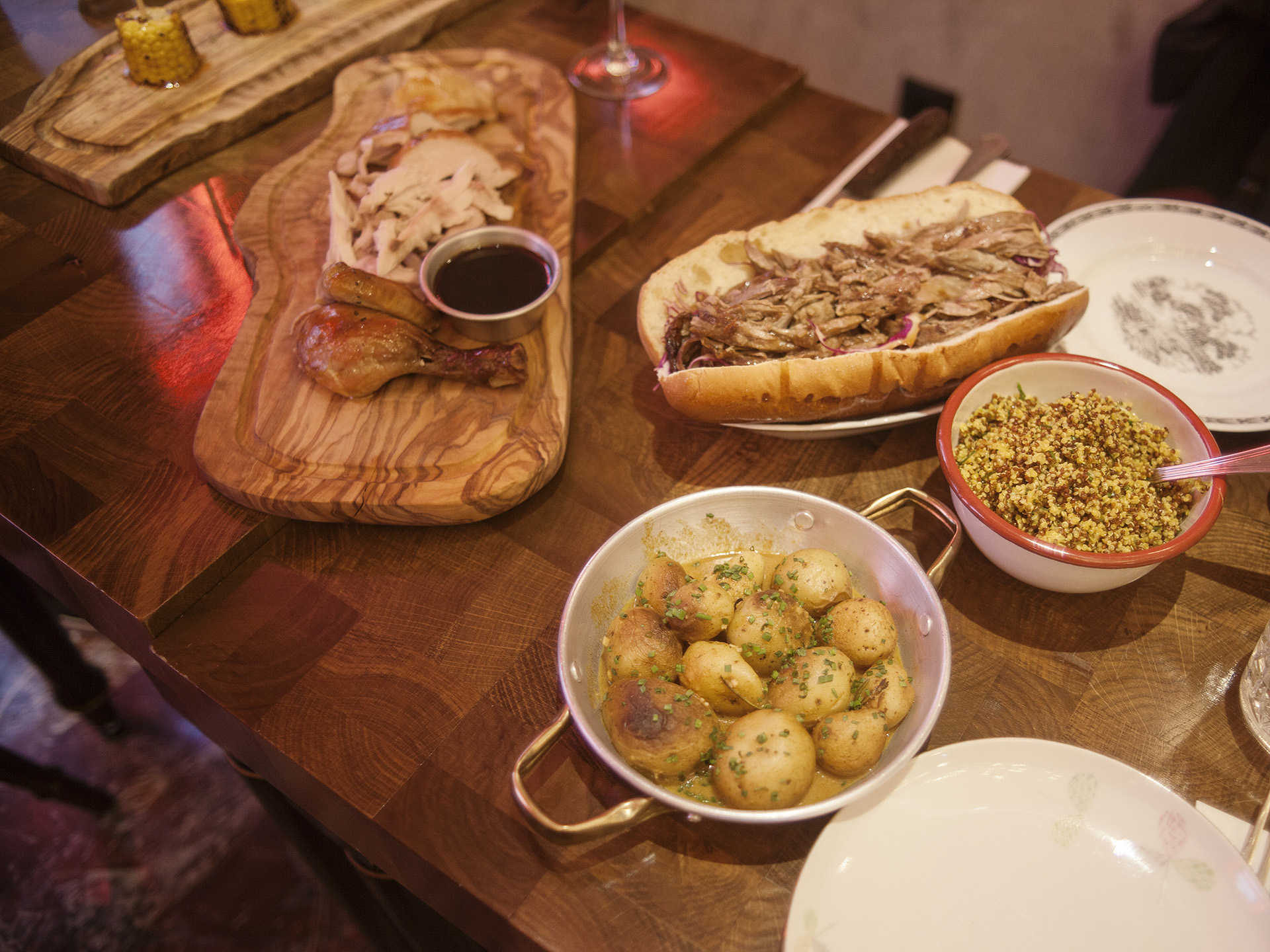 ΜΙσό κοτόπουλο με smokey BBQ σος, spit roll με pulled πάπια, σαλάτα με τραγάνα κρεμμύδια και ψιλοκομμένα λαχανικά και baby πατάτες για συνοδευτικό