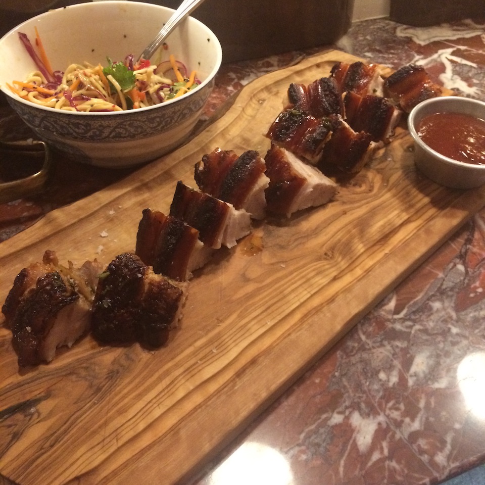 Απλά τα πράγματα. Τρεις επιλογές: κοτόπουλο (το μισό €10), τραγανή πάπια (το best seller του καταλόγου που περνά από τη χρονοβόρα διαδικασία «καθάρισμα-μαρινάρισμα-φούσκωμα-στέγνωμα-ψήσιμο», η μισή €16) και πορκέτα (προσωπικό fav αυτό το θαυμάσιο ιταλικό χοιρινό ρολό με μυρωδικά και καρυκεύματα, τυλιγμένο στην κρατσανιστή κρούστα του λίπους του – τα 400 γραμμάρια €13). Αν είστε πάνω από 2 άτομα, πάρτε ένα ταμπλό από το καθένα. Θα διαπιστώσετε πως το σιγοψήσιμο μαλακώνει ηδονικά το κρέας σε επίπεδα «τρυφερό σαν την καρδιά ενός μαρουλιού», και ειδικά η εναλλαγή της πιο λιπαρής porchetta με την edgy πάπια ανταμοίβει. Το μπαλταδάκι, αντί για μαχαίρι, στην πραγματικότητα δε θα σας πολυχρειαστεί, αλλά είναι το trademark του μαγαζιού κάνοντας ήδη καλή καριέρα στα σόσιαλ μίντια (μπορείτε να το αγοράσετε κιόλας φεύγοντας για €25).