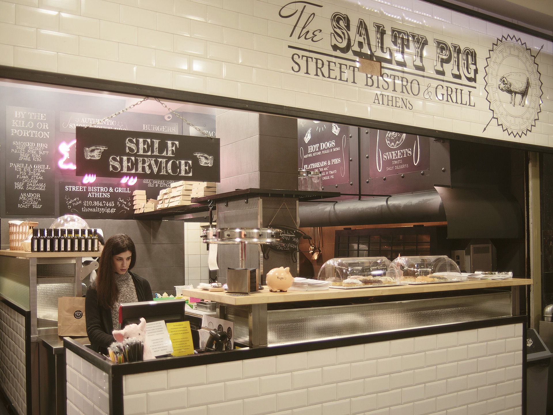 Στο τέλος της κουβέντας μας, κι ενώ έχω ανεβάσει πυρετό από την ανυπομονησία να συνομιλήσω με τα πιάτα που έχουν μόλις ετοιμαστεί για τη φωτογράφιση, ο Δημήτρης Παντελεάκης (ένας εκ των τριών σεφ, εκ των πέντε ιδιοκτητών του Salty Pig) έχει μια μικρή ανησυχία. «Ό,τι και να είπαμε, ό,τι περιγραφές κι αν έχει πάρει ήδη το μαγαζί, δεν παύει να είναι ένα “γρηγοράδικο”», μου λέει. Από τη μία είναι το talk of the town γύρω από το «καινούριο με τα καπνιστά που άνοιξε στα Εξάρχεια, εκεί κοντά στο ΠΑΣΟΚ» που διαδίδεται ταχύτατα από τα τέλη Νοεμβρίου όταν το Αλμυρό Γουρούνι έκανε εγκαίνια. Κι οδηγεί σε παρεξηγήσεις, όπως το να παίρνει κόσμος και να ζητά να κλείσει τραπέζι, πιστεύοντας ότι η διαφορετική κρεατοφαγική πρόταση που προτείνει συνεπάγεται επισημότητες, μεγάλες σάλες και τέτοια πράγματα. Στην πραγματικότητα, πρόκειται για ένα self service μικρό εστιατόριο πόλης και θα φας κάτι στα γρήγορα ενώ κάθεσαι στα ψηλά σκαμπό ή μοιράζεσαι έναν πάγκο με τη διπλανή παρέα. Ή θα παραγγείλεις delivery θέλοντας να βάλεις λίγο comfort στο γραφείο ή το σαλόνι σου.