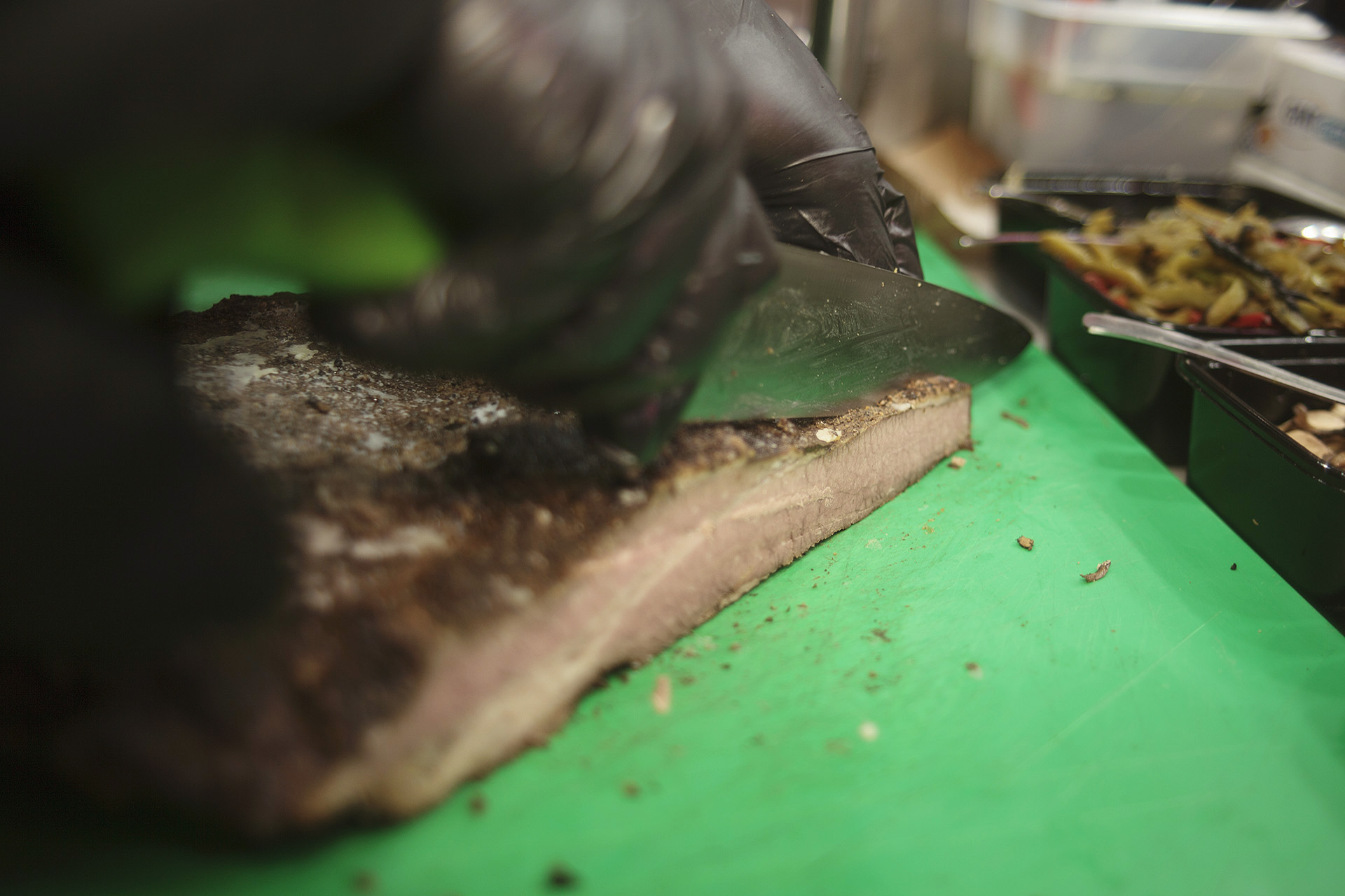 Επιμένοντας να το κάνουν με τον σωστό αμερικάνικο τρόπο, κι όχι υποκύπτοντας σε «ελληνικές προσαρμογές», στα κακέκτυπα από τα οποία έχουν υποφέρει διάφορες διεθνείς κουζίνες στην Αθήνα – ας μην πάμε πιο μακριά από την ιταλική. Το «κάπνισμα» στο Salty Pig δε γίνεται με «κλεψιές», τύπου σταγόνες υγρού καπνού, αλλά στον ειδικά κατασκευασμένο smoker φούρνο που μου δείχνει με περηφάνεια ο Δημήτρης. Ένας μικρός μαύρος πύργος, στη βάση του καίνε ξύλα, και μέσα του αναπαύονται σε φιλόξενες σχάρες τα κρέατα για όσες ώρες χρειαστεί. Ας πούμε, ένα τετράκιλο κομμάτι brisket θα μείνει στους 107-110 βαθμούς για περίπου 6 ώρες. Μέχρι το κολλαγόνο που «φοράει» αυτό το θεωρητικά δευτεροκλασάτο κομμάτι από το κάτω μέρος του βοδινού στήθους να γίνει ζελατίνα και να το μαλακώσει τόσο πολύ που σχεδόν μπορείς να το κόψεις με το δάκτυλό σου.
