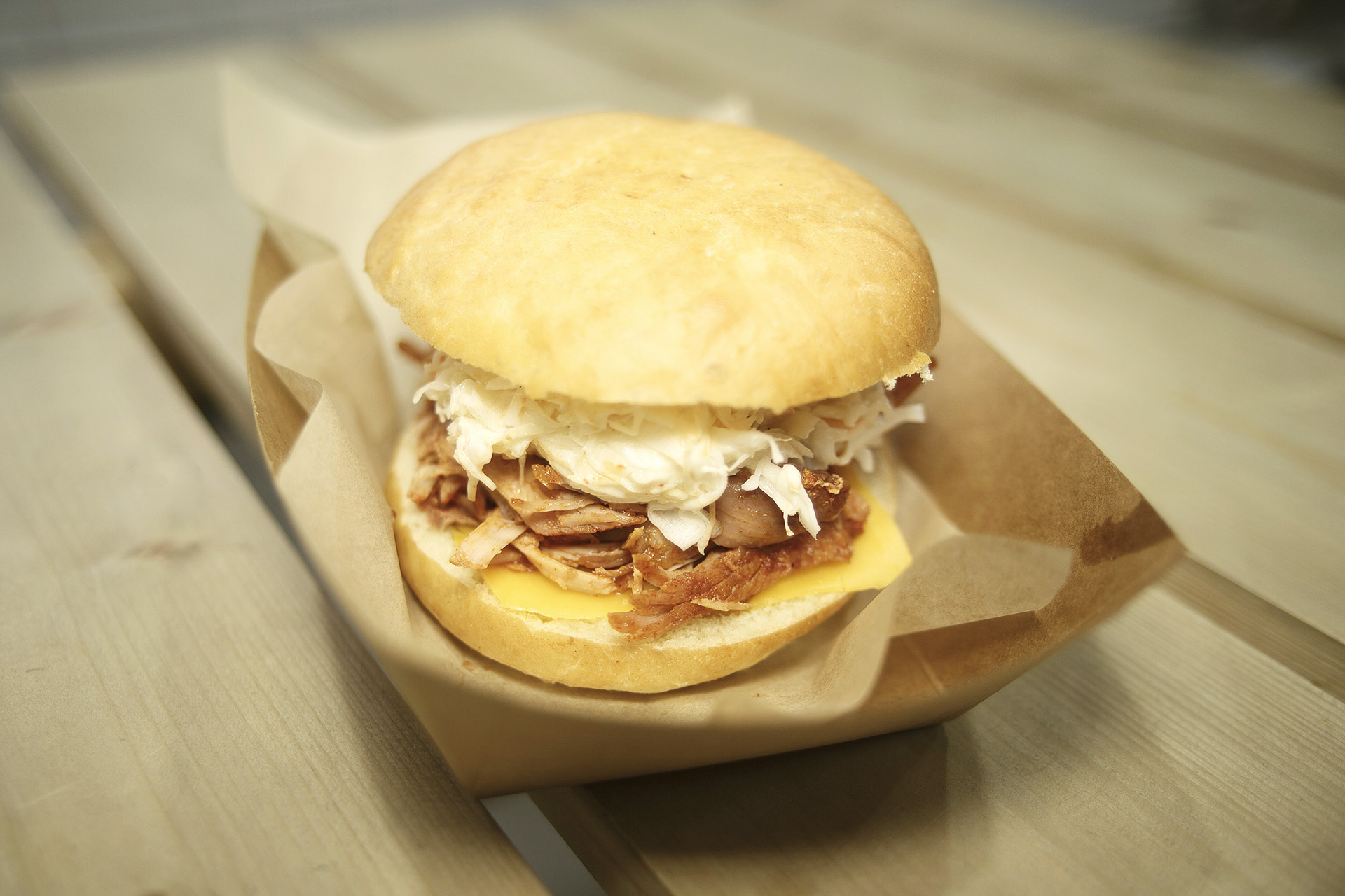 Μπριός με χοιρινή σπάλα «τραβηχτή» με τσένταρ, coleslaw και σάλτσα καυτερής πιπεριάς