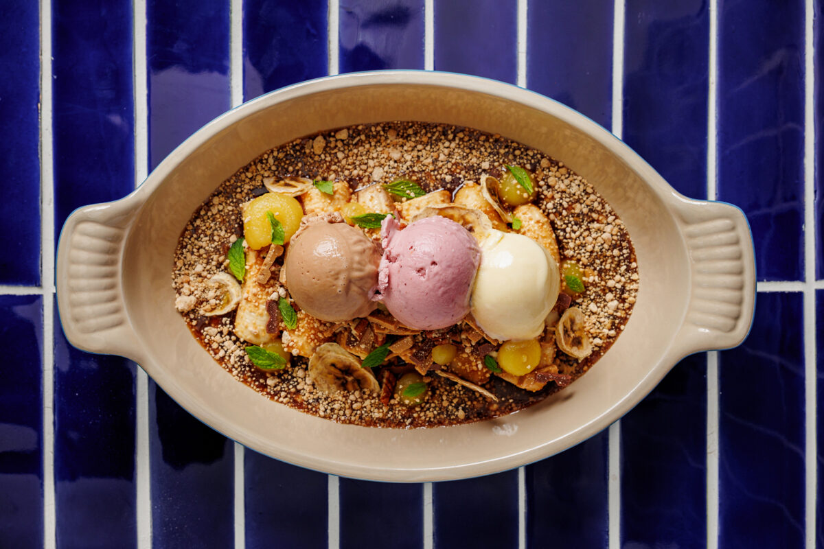 Στα επιδόρπια οι επιλογές ήταν το Banana Split (καραμελωμένη μπανάνα, κρέμα ανανά, παγωτό Νεάπολης) το οποίο τρώνε άνετα δύο άτομα και σκάνε αλλά και η Πάβλοβα με μους σοκολάτας και τριαντάφυλλου, αμύγδαλο και σορμπέ μύρτιλου.