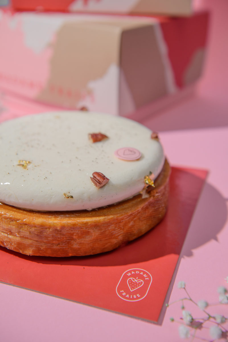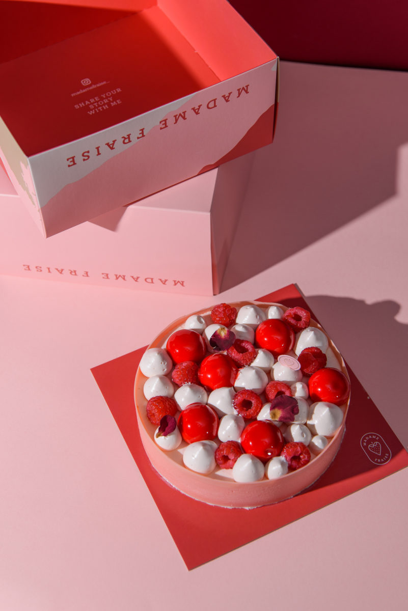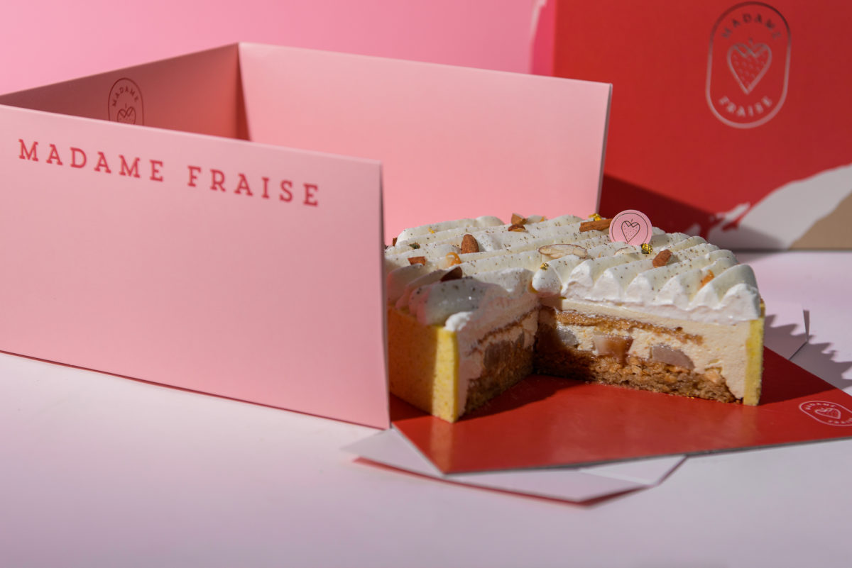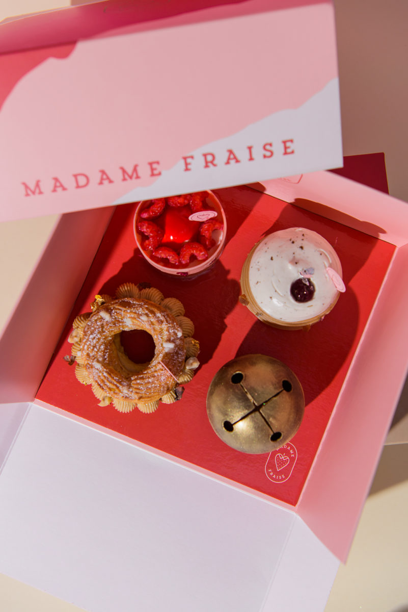 Μια Paris-Brest με κρέμα φουντουκιού και τραγανή πραλίνα, μια σφαίρα σοκολάτας με καραμέλα και φυστίκια που θυμίζει χριστουγεννιάτικο στολίδι, μια mont blanc με κάστανο και βανίλια και ένα διαφορετικό cheesecake φτιαγμένο με μους τριαντάφυλλο, μαρμελάδα βατόμουρο και σαμπλέ αμυγδάλου, μπαίνουν στο ροζ κουτί του Madame Fraise, για όσους θέλουν να γευτούν παραπάνω από ένα γλυκά από αυτά που φτιάχνουν ο Ευγένιος με τον Γιάννη. Από κει κι έπειτα, σε μέγεθος τούρτας μπορείτε να βρείτε την Amande, μία τούρτα με biscuit αμυγδάλου, bavaroise αρωματισμένη με τόνκα, μαρέγκα αμυγδάλου και αχλάδι confit, το μιλφέιγ με την βανίλια και την πραλίνα πεκάν, αλλά και την Gianduja Marron, με τη μους κάστανο, τη τζιαντούγια και τα αρώματα yuzu. Σε μορφή τούρτας βγαίνει επίσης η Paris Brest, αλλά και το cheesecake τριαντάφυλλο, το οποίο είναι έτσι φτιαγμένο ώστε να ενώνει και τις δύο εκδοχές του, αυτή του ψημένου, αλλά και αυτή με την μους. Όλα αυτά μπορείτε να τα απολαύσετε είτε παραγγέλνοντάς τα, είτε ακόμα καλύτερα πηγαίνοντας να τα παραλάβετε οι ίδιοι από το εργαστήριό τους στο Παγκράτι.