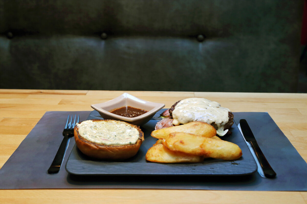 Burger black angus με αφρό cheddar, sauce tartare και τραγανές πατάτες τηγανιτές