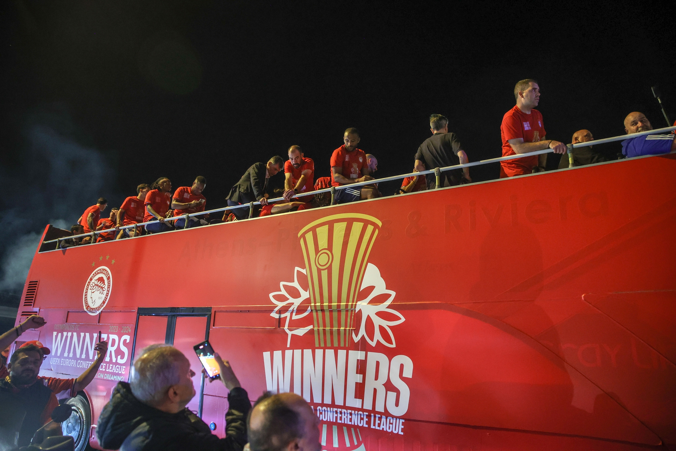 «Κάηκε» ο Πειραιάς, μέχρι τις πρώτες πρωϊνές ώρες, από τον κόσμο του Ολυμπιακού που κατέκλυσε τους δρόμους για να πανηγυρίσει την ιστορική ευρωπαϊκή κατάκτηση των «ερυθρολεύκων», μετά το 1-0 επί της Φιορεντίνα στην παράταση για τον τελικό του UEFA Europa Conference League. Καπνογόνα και βεγγαλικά έκαναν τη νύχτα… μέρα, ενώ τα συνθήματα δονούσαν την ατμόσφαιρα. Ειδικά τη στιγμή που οι πρωταθλητές Ευρώπης έφτασαν στο Δημοτικό Θέατρο, λίγο πριν τις 5 τα ξημερώματα, προκειμένου να γιορτάσουν όλοι μαζί την πρώτη ευρωπαϊκή κούπα ελληνικής ομάδας.
