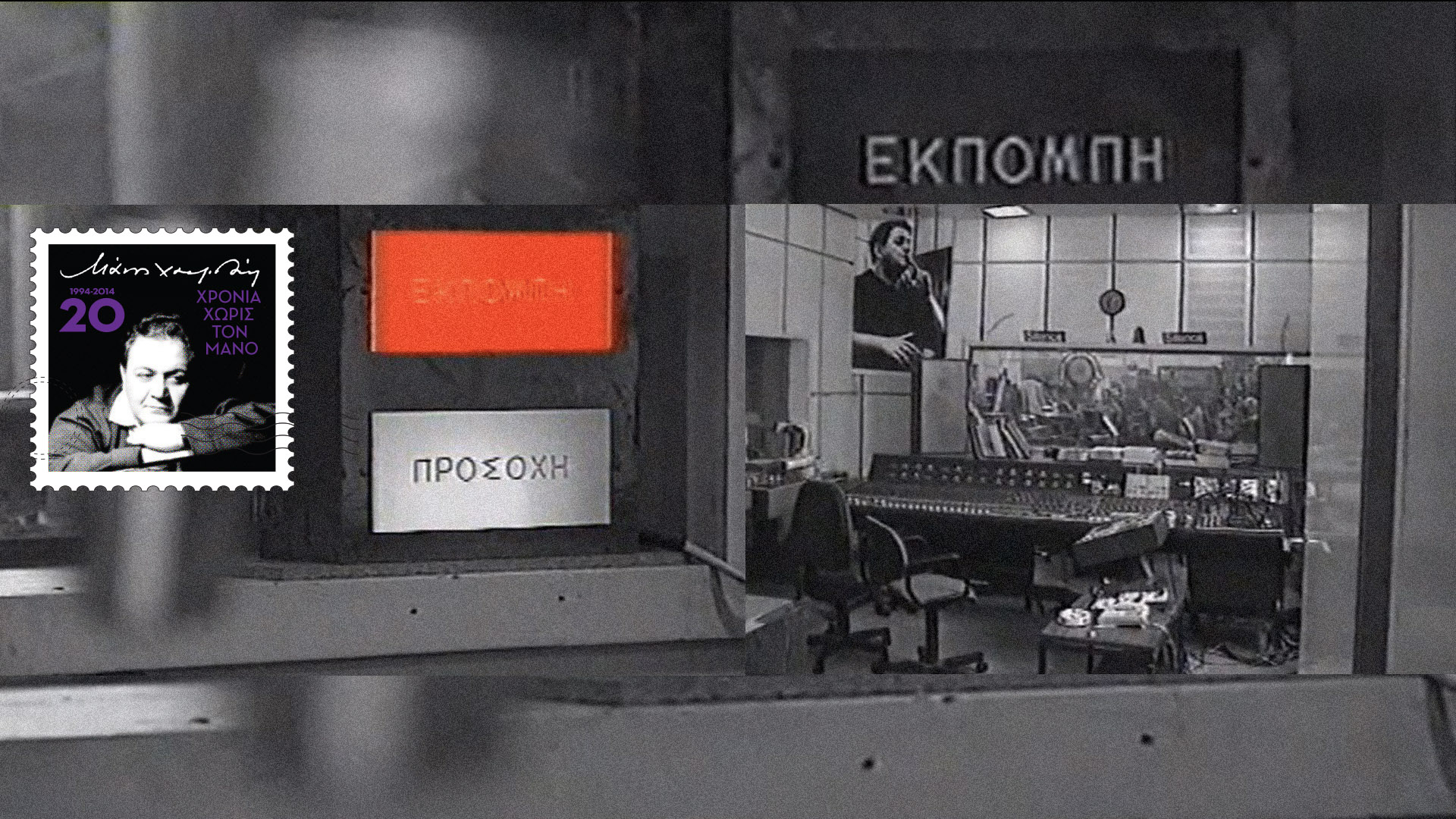 Το στούντιο του Τρίτου Προγράμματος , με τη φωτογραφία του Μάνου Χατζιδάκι, στο Ραδιομέγαρο της ΕΡΤ.