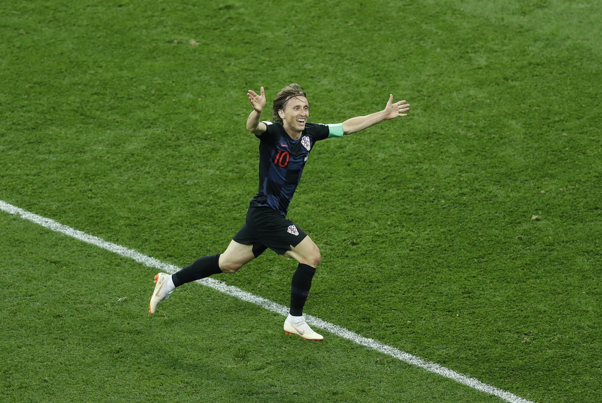 epa06829049 Luka Modric of Croatia celebrates after scoring the 0-2 goal during the FIFA World Cup 2018 group D preliminary round soccer match between Argentina and Croatia in Nizhny Novgorod, Russia, 21 June 2018. (RESTRICTIONS APPLY: Editorial Use Only, not used in association with any commercial entity - Images must not be used in any form of alert service or push service of any kind including via mobile alert services, downloads to mobile devices or MMS messaging - Images must appear as still images and must not emulate match action video footage - No alteration is made to, and no text or image is superimposed over, any published image which: (a) intentionally obscures or removes a sponsor identification image; or (b) adds or overlays the commercial identification of any third party which is not officially associated with the FIFA World Cup) EPA/RITCHIE B. TONGO EDITORIAL USE ONLY