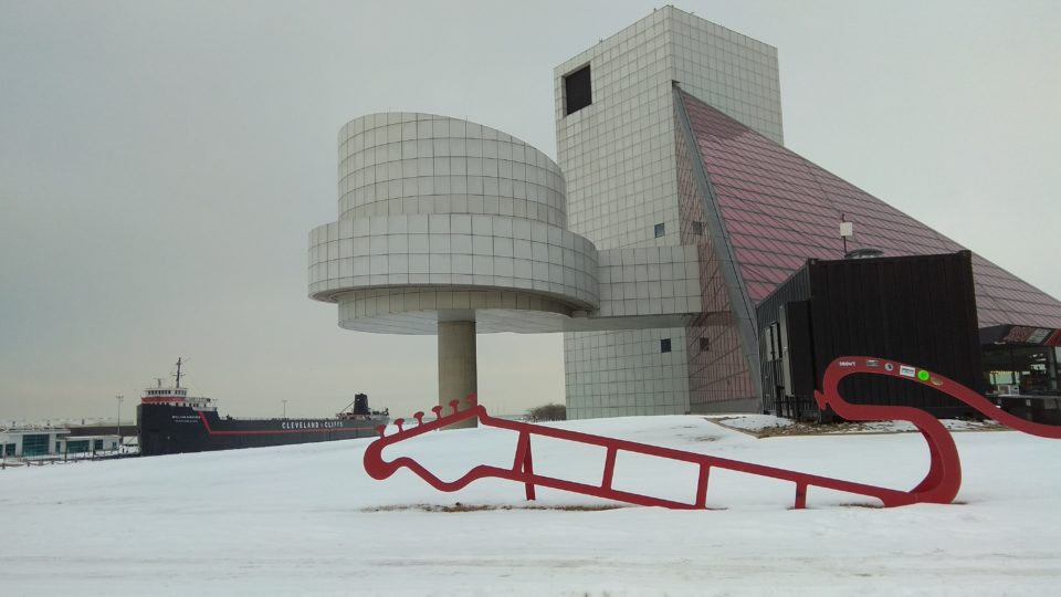 Παρασκευή, 9 Φεβρουαρίου 2018: Την επόμενη μέρα κάναμε μια στάση στο θρυλικό Rock & Roll Hall of Fame στην πόλη του Κλίβελαντ. Στεκόμαστε μπροστά στο αφιέρωμα για  την μουσική έκρηξη του grunge κινήματος του Σιάτλ στα 90s, πίσω αχνοφαίνεται μια απ’ τις κιθάρες του Chris Cornell και του κιθαρίστα των Pearl jam (η σπασμένη ακριβώς πίσω μας) και στο ίδιο section βρισκόταν και μια κιθάρα του Kurt Cobain. Από πάνω μας έχουμε μια αφίσα Του Neil Young με τους Pearl Jam και παραδίπλα μια των Melvins από live της τότε περιόδου! Πραγματικό ρίγος!