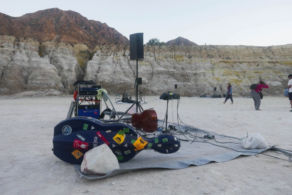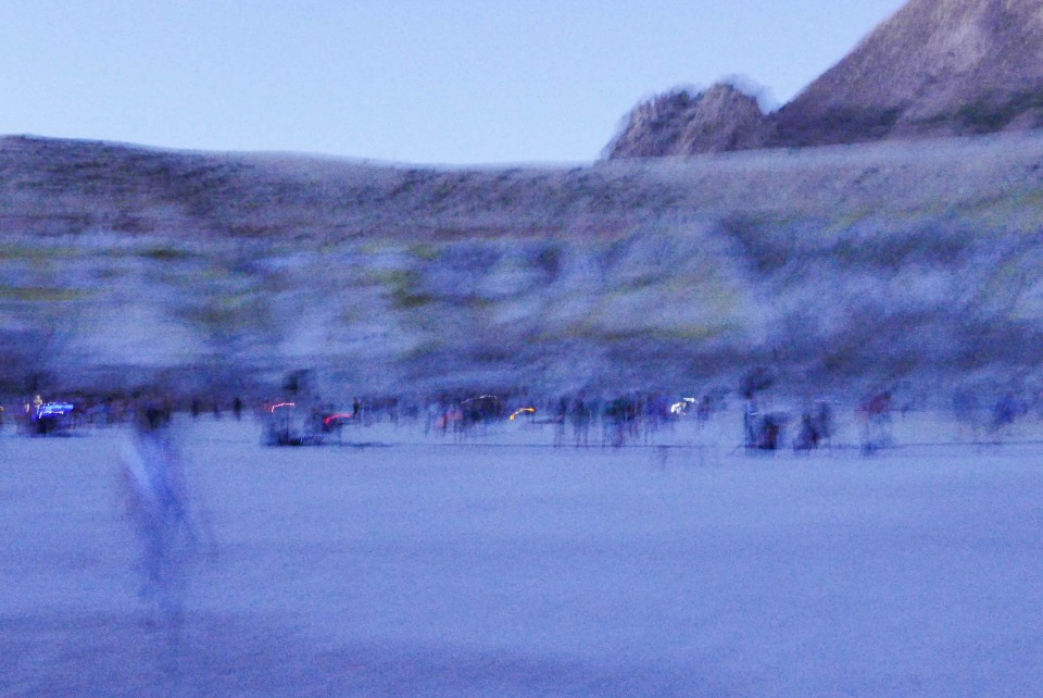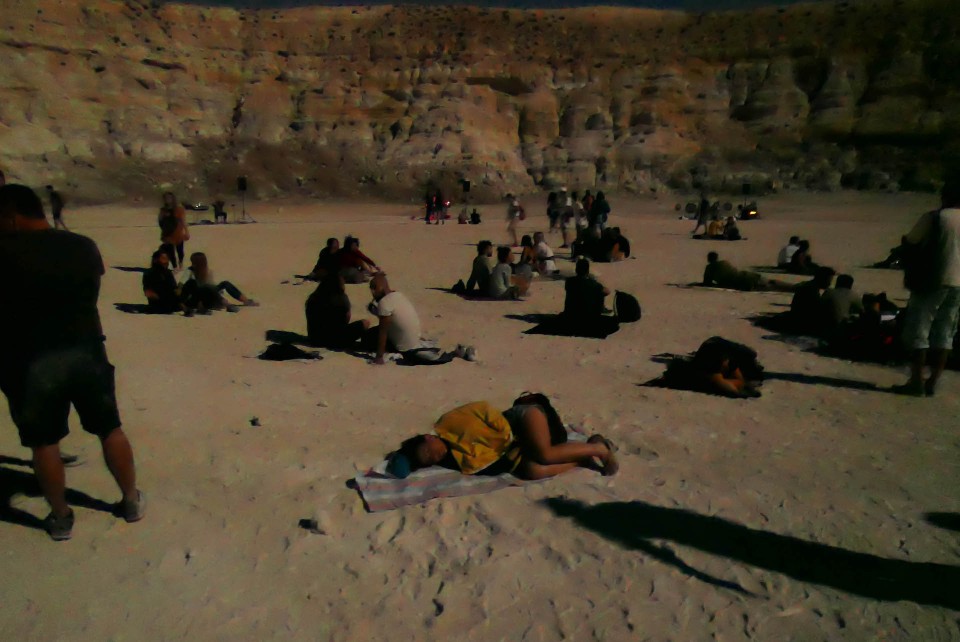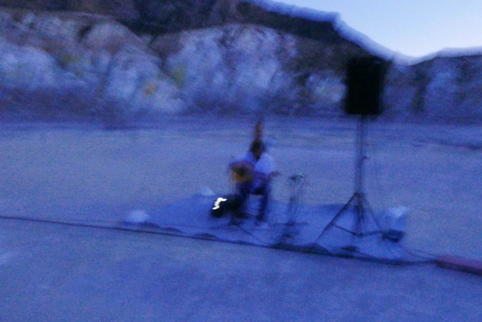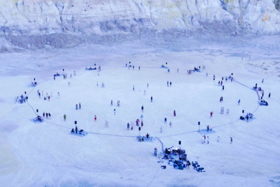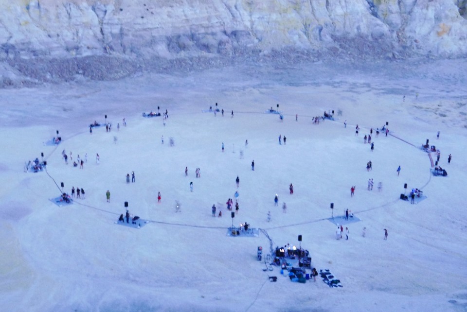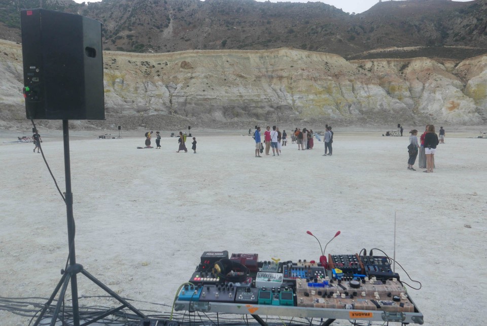 Μέσα σε έναν κρατήρα (τον περιώνυμο Στέφανο) όπου είχε στηθεί ένας νέος προσωρινός «κρατήρας», ένας κύκλος με 15 σταθμούς -έναν για κάθε μουσικό. Κάθε σταθμός περιελάμβανε τον μουσικό εξοπλισμό του κάθε μουσικού και ένα ηχείο (και όλα αυτά «πατούσαν» πάνω σε ένα ειδικό υλικό που ήταν στρωμένο σε κάθε σταθμό ώστε να μην φθαρούν από την πολύωρη επαφή με το ηφαιστειακό πέτρωμα). Μέσα και έξω (αλλά κυρίως μέσα) από τον κύκλο οι θεατές επιδίδονταν σε μια αέναη άναρχα αρμονική κυκλική (και κάποτε ελλειψοειδής) χορογραφία – κάπως σαν να περιστρέφονταν τόσο γύρω από τους εαυτούς τους, όσο και γύρω ή και μέσα (αλλά κυρίως γύρω) από ομόκεντρους κύκλους. Η μουσική, αυτό το αυτοσχεδιαστικό (άκρως δημοκρατικό) πείραμα διήρκεσε αυστηρά 634 λεπτά (όσα δηλαδή μεσολάβησαν από την δύση του ήλιου στις 19.58 της 18ης Αυγούστου μέχρι την ανατολή στις 06.32 της 19ης Αυγούστου) όπως ήταν προγραμματισμένο. Και λέω άκρως δημοκρατικό γιατί σε αντίθεση με τις συναυλίες, τους δίσκους και όλες τις υπόλοιπες περιπτώσεις που έρχεσαι σε επαφή με τη μουσική, αυτή ακούγεται πάντα (ή σχεδόν πάντα) σαν ένα ενιαίο σύνολο -ένα αποτέλεσμα που προκύπτει από τον ήχο διαφόρων οργάνων, από τον συνδυασμό αυτών στα κανάλια της κονσόλας (ή στα αυλάκια ενός βινυλίου π.χ.) – εδώ ο ακροατής μπορούσε να διαλέξει τον τρόπο ακρόασης, τόσο επιλέγοντας σε ποιον σταθμό θα βρίσκεται πιο κοντά, όσο και σε ποιο σημείο του χώρου (ώστε οι σκόρπιες μουσικές φράσεις που ακούγονταν από δω και από εκεί να συνθέτουν κάθε φορά μια διαφορετική ακουστική εμπειρία – άλλοτε χαοτική και άλλοτε πιο συγκεκριμένη).