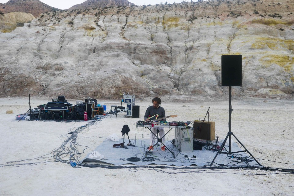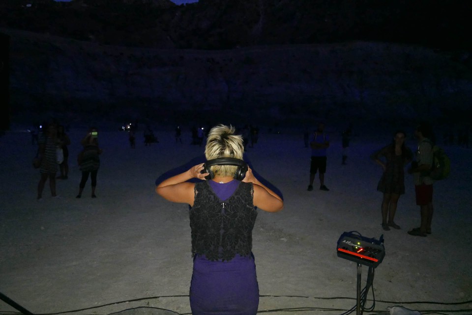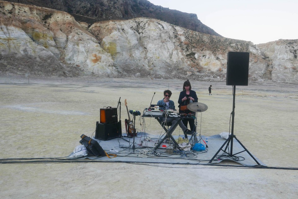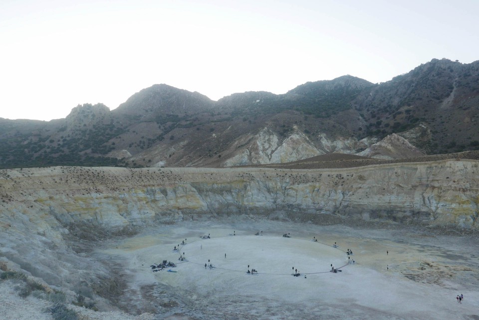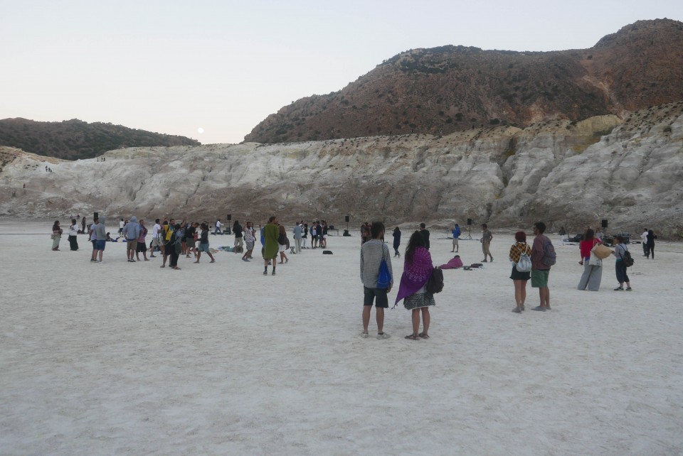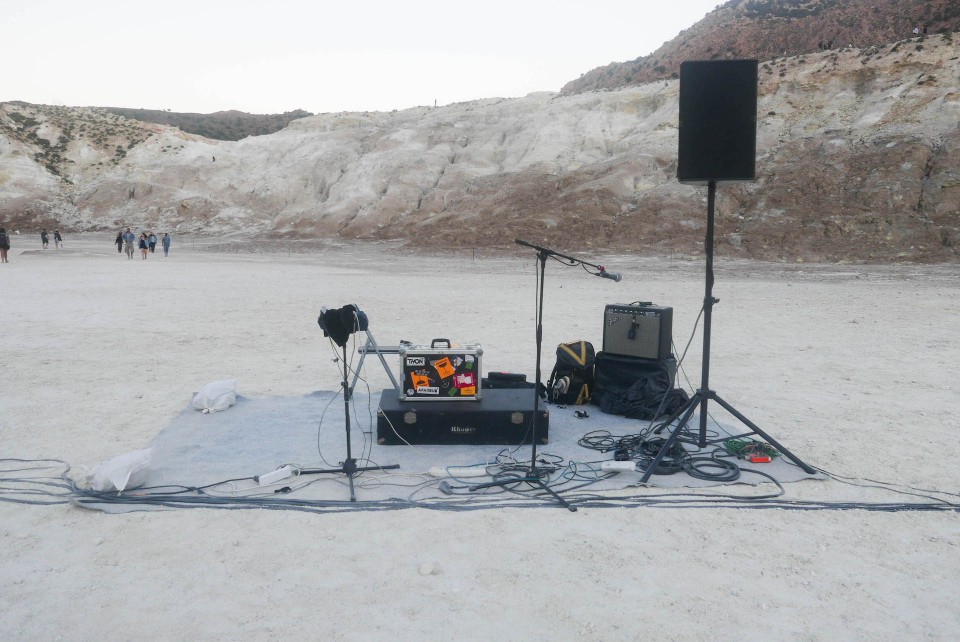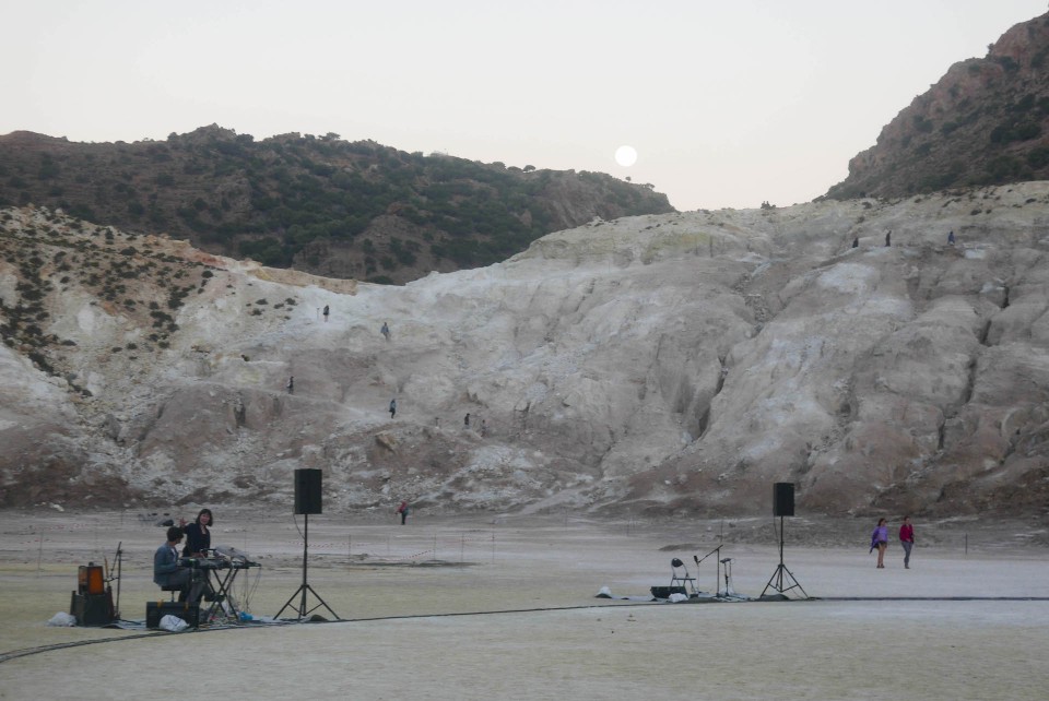 Κάπως σαν να είσαι στο σετ του Solaris του Ταρκόφκσι, της Οδύσσειας του Διαστήματος του Κιούμπρικ ή του Moon του Duncan Jones. Ένα παράξενα απόκοσμο τοπίο (άλλοτε έμοιαζε με άλλο πλανήτη και άλλοτε με παγετώνα στο Βόρειο Πόλο) με το φως από το μοναστήρι του Προφήτη Ηλία στα Νικιά να λαμπυρίζει σαν μικροσκοπικό λεντάκι πάνω στην κόψη της καλντέρας, τα υποκίτρινα πετρώματα να δημιουργούν layers εγκεφαλικής ταλάντωσης και οπτικές ψευδαισθήσεις και η αυγουστιάτικη πανσέληνος να λούζει με κινηματογραφικό φως τον κρατήρα (διαμέτρου 300 μέτρων) του ηφαιστείου ενός μικρού ελληνικού νησιού που βρίσκεται κάπου μεταξύ Κω, Τήλου και τουρκικών παραλίων. Μια σχεδόν (ή μήπως εξ ολοκλήρου) εξωσωματική εμπειρία, αποτέλεσμα ενός μοναδικού για τα ελληνικά (αλλά και για τα διεθνή) δεδομένα site specific πειράματος, ένα «ζοφερό αποκύημα» (οκ, πλάκα κάνω) της φαντασίας του Κωνσταντίνου Δαγριτζίκου του Six d.o.g.s (με την υποστήριξη της Στέγης), μια συναυλία μέσα στον κρατήρα ενός ηφαιστείου.