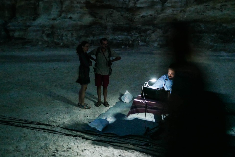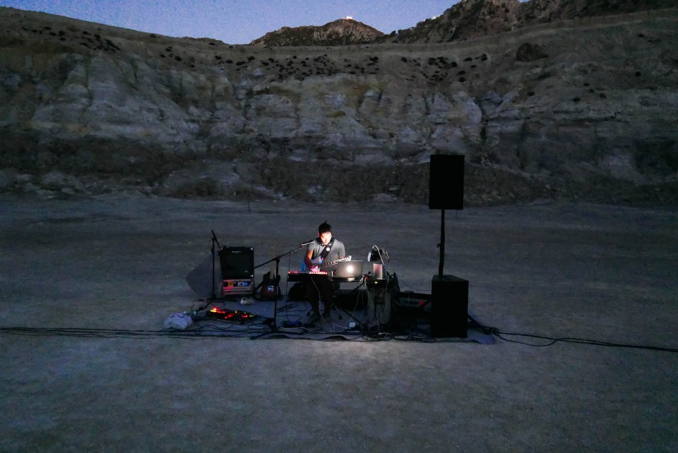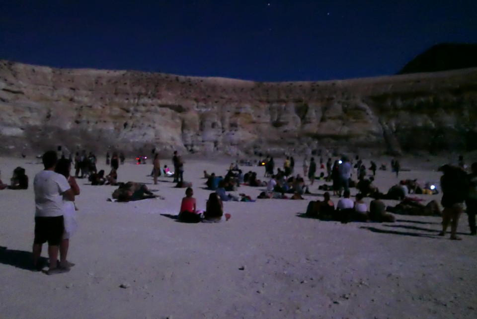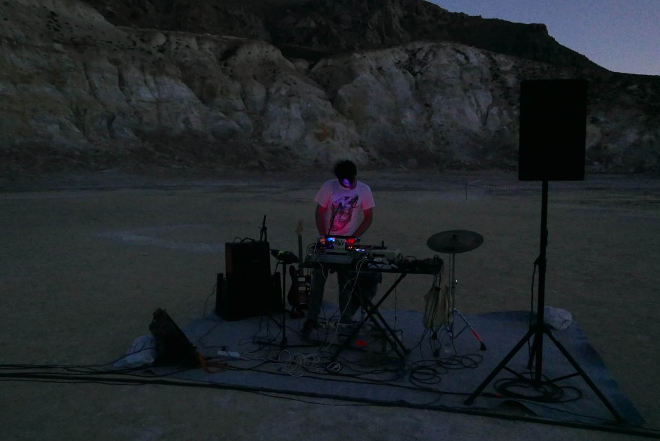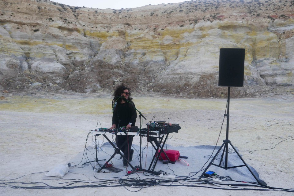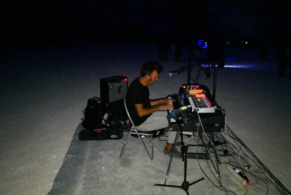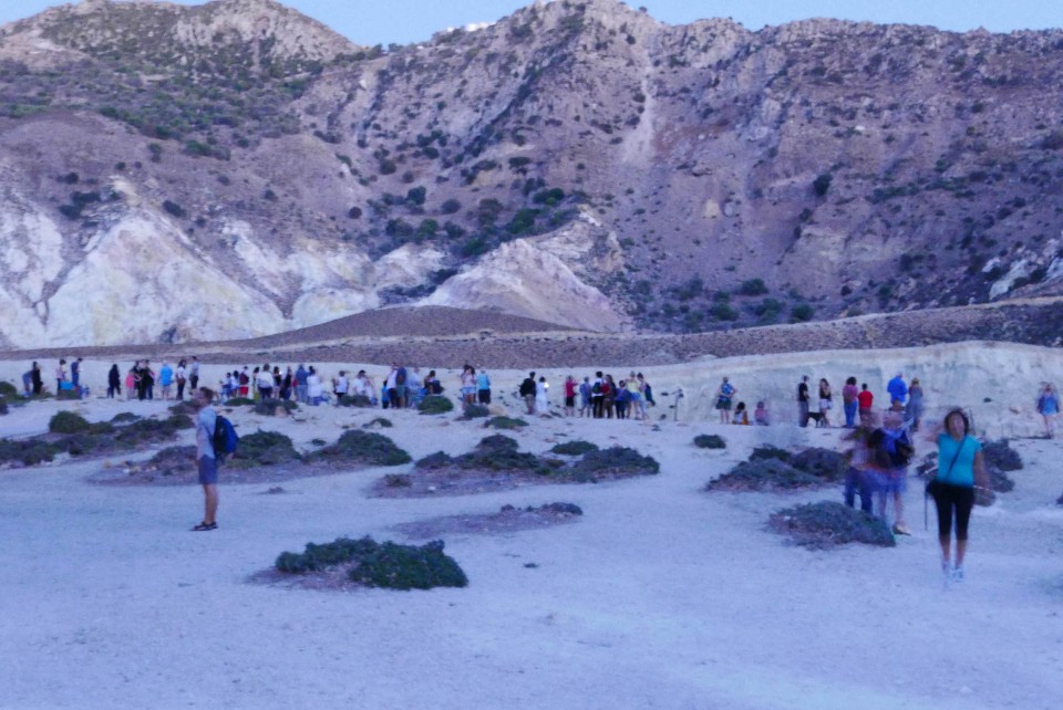 Κάπως σαν να είσαι στο σετ του Solaris του Ταρκόφκσι, της Οδύσσειας του Διαστήματος του Κιούμπρικ ή του Moon του Duncan Jones. Ένα παράξενα απόκοσμο τοπίο (άλλοτε έμοιαζε με άλλο πλανήτη και άλλοτε με παγετώνα στο Βόρειο Πόλο) με το φως από το μοναστήρι του Προφήτη Ηλία στα Νικιά να λαμπυρίζει σαν μικροσκοπικό λεντάκι πάνω στην κόψη της καλντέρας, τα υποκίτρινα πετρώματα να δημιουργούν layers εγκεφαλικής ταλάντωσης και οπτικές ψευδαισθήσεις και η αυγουστιάτικη πανσέληνος να λούζει με κινηματογραφικό φως τον κρατήρα (διαμέτρου 300 μέτρων) του ηφαιστείου ενός μικρού ελληνικού νησιού που βρίσκεται κάπου μεταξύ Κω, Τήλου και τουρκικών παραλίων. Μια σχεδόν (ή μήπως εξ ολοκλήρου) εξωσωματική εμπειρία, αποτέλεσμα ενός μοναδικού για τα ελληνικά (αλλά και για τα διεθνή) δεδομένα site specific πειράματος, ένα «ζοφερό αποκύημα» (οκ, πλάκα κάνω) της φαντασίας του Κωνσταντίνου Δαγριτζίκου του Six d.o.g.s (με την υποστήριξη της Στέγης), μια συναυλία μέσα στον κρατήρα ενός ηφαιστείου.