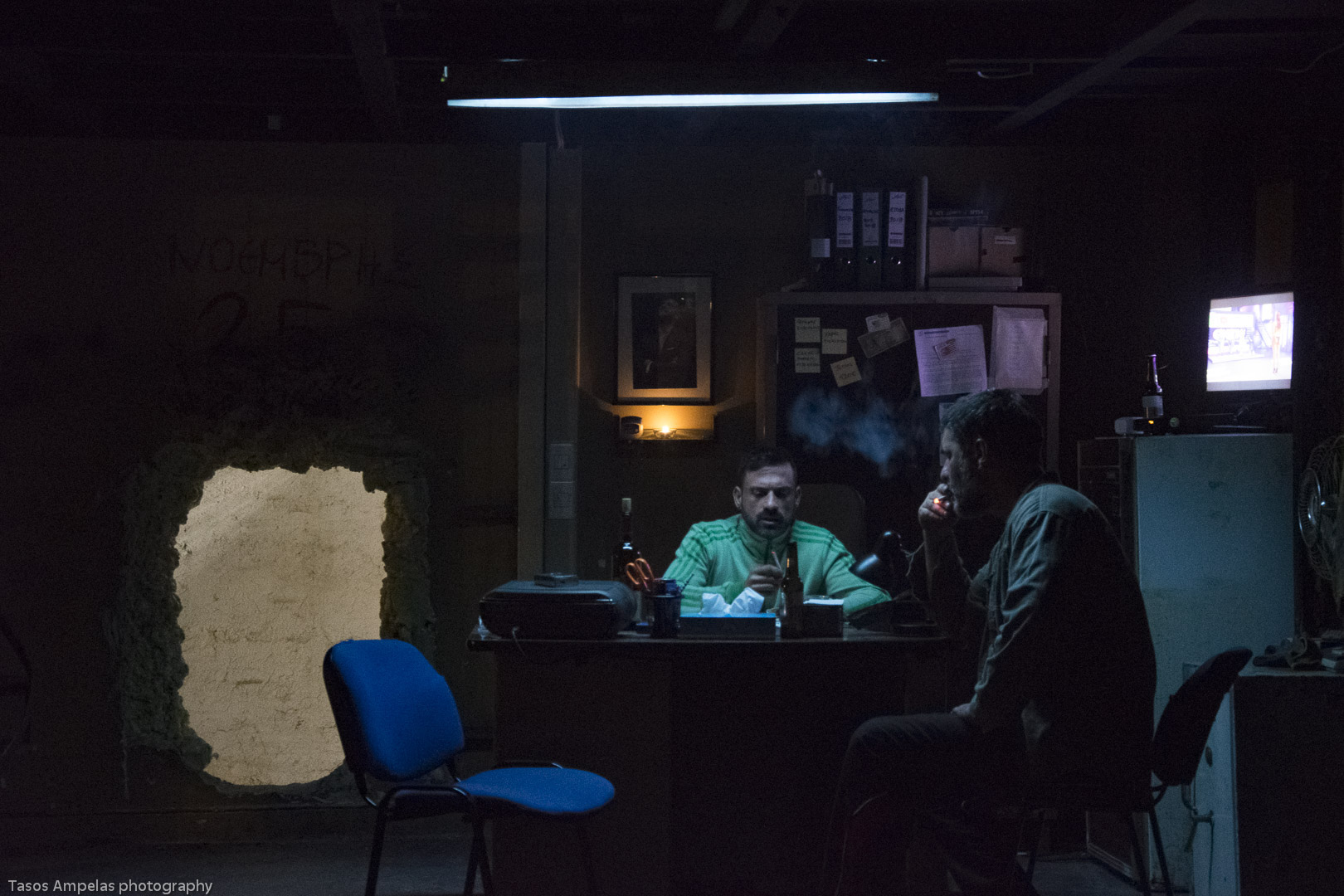 Γρήγορα περνάμε στη διπλανή αίθουσα, περίπου ίδιων διαστάσεων, όπου έχει στηθεί το σκηνικό του χώρου (σκηνικά-κοστούμια Αλεξία Θεοδωράκη) που θα γίνει σπίτι και δουλειά του Βασίλη και του Λένου για το επόμενο διάστημα. Κάποιος κάνει οξυγονοκόλληση, με τις σπίθες να πετάγονται, δίπλα υπάρχει το γραφείο του αφεντικού, του Στέλιου, ενός τζάμπα μάγκα, που έχει για εικονοστάσι μια φωτογραφία του Παντελή Παντελίδη με κεράκι από κάτω. Εκεί εργάζονται και μένουν ο Γιώργος, που όλοι φωνάζουν «γέρο» και κάνει τις βοηθητικές δουλειές, αφού έχει χάσει το χέρι του, ο Μάνος, ένας μικροκαμωμένος πανέξυπνος τύπος, που φωτίζει με διάφορα κιτς λαμπιόνια τη σκοτεινιά της ζωής του, ο Λευτέρης ο Ελληνάρας και ο Κούρδος Γιανμάζ (ερασιτέχνης ηθοποιός). Είναι και η Νικολέττα, η γυναίκα του αφεντικού, ο οποίος πολύ τη ζηλεύει κι αυτή κάνει ό,τι μπορεί για να καλλιεργεί τη ζήλεια του. Ντύνεται προκλητικά, φοράει πατσουλί, προκαλεί τον αρσενικό πληθυσμό του μηχανουργείου.