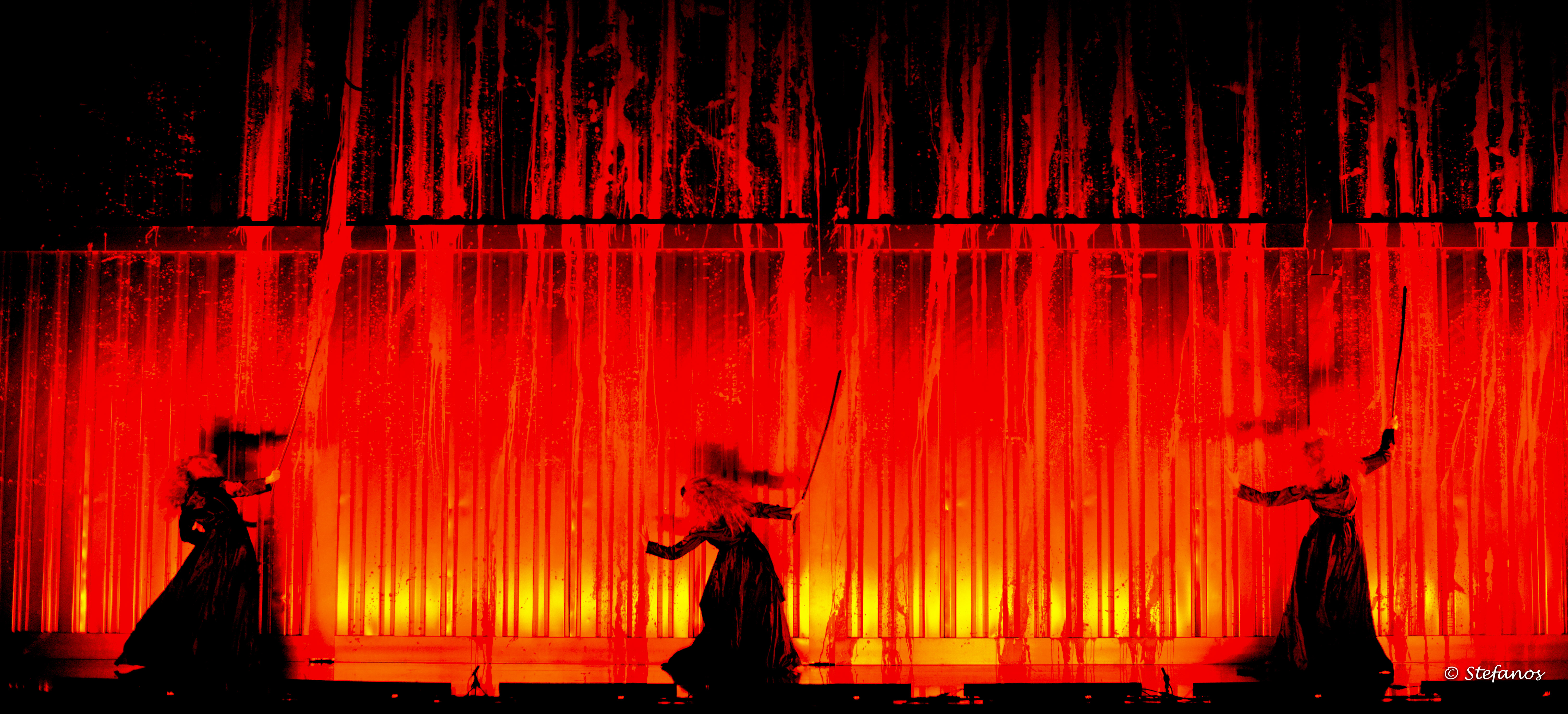 Splatter και Delacroix. Αίμα, κι άλλο αίμα που ξεπλένεται μόνο με αίμα. Ναι, η σκηνή της αίθουσας Τριάντη γέμισε με αίμα και υπήρξαν κάποιες στιγμές που νόμιζες ότι σταγόνες του διασχίζουν την αίθουσα, ακουμπούν στα χέρια σου. Ο Macbeth του Βέρντι, που παρουσίασε η Εθνική Λυρική Σκηνή, είναι ένα οπερατικό αυθεντικό σπλάτερ, χωρίς ρωγμές στο ρυθμό, με λίγες αμήχανες στιγμές, με την ορχήστρα της Λυρικής απλά ονειρική, τη χορωδία να εκπλήσσει με τη δύναμή της, με τους φωτισμούς και τα σκηνικά να δημιουργούν ατμόσφαιρα χειρουργείου, σχεδόν με ανεπαίσθητη μυρωδιά σφαγείου (o Francis Bacon σίγουρα θα ενέκρινε).