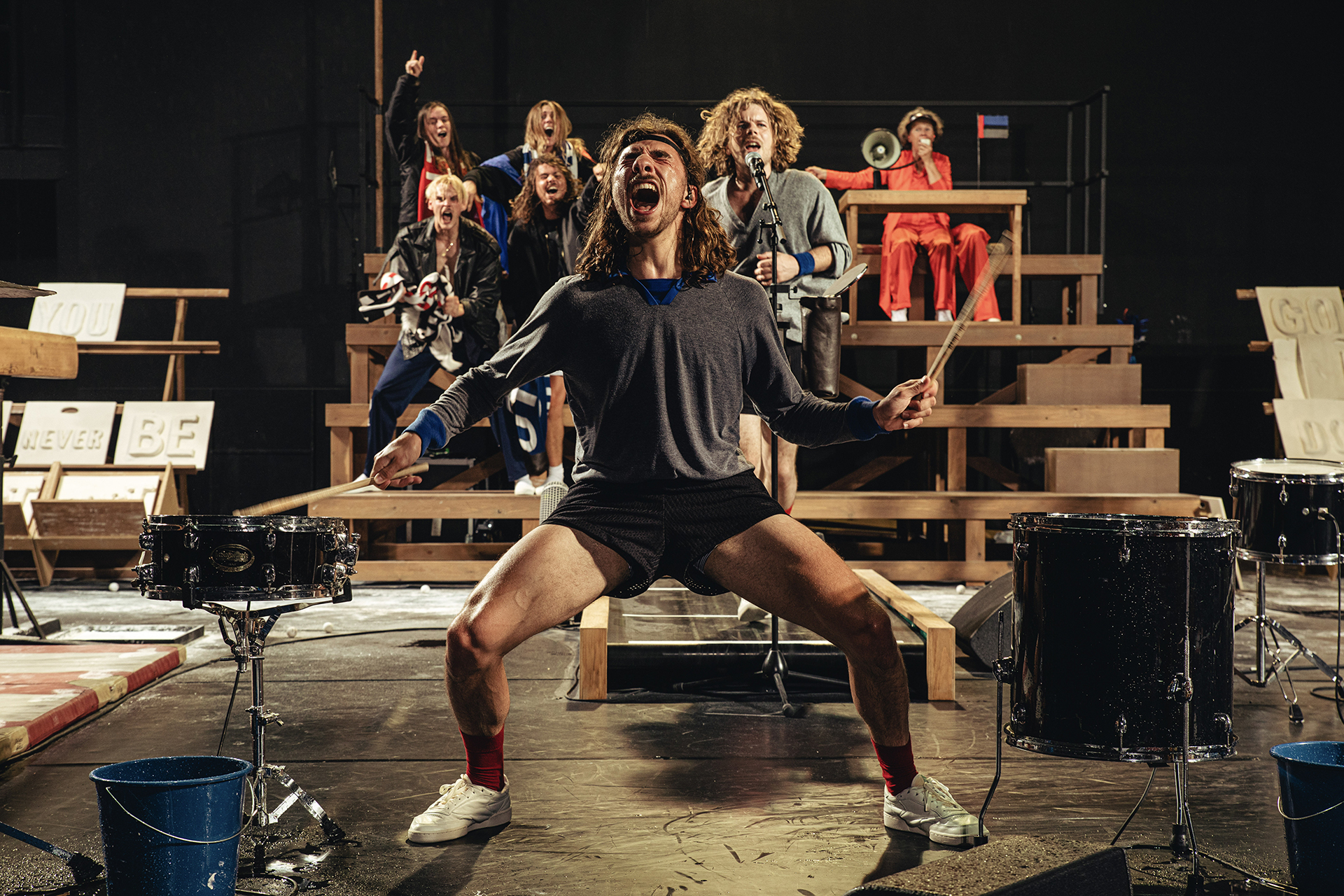 Το βασικό ανσάμπλ χορευτών είναι μια ιδιόρρυθμη μπάντα: μουσικοί που παίζουν βιολί ισορροπώντας πάνω σε μια δοκό, που κάνουν κάμψεις όποτε χρειάζεται να αγγίξουν μια χορδή στο μπάσο, που πάνε μπρος πίσω για να παίξουν τα κρουστά ή επιχειρούν μικρά άλματα για να ακουμπήσουν τα πλήκτρα του keyboard. Ένα και μόνο τραγούδι παίζουν. Ξανά και ξανά. Σε άλλο τέμπο κάθε φορά, μα πάντα με αμείωτο πάθος και ένταση. Μια χορογραφημένη στην εντέλεια συναυλία εκτυλίσσεται ενώπιον μας για χάρη ενός και μόνο τραγουδιού, το οποίο σταδιακά, με την επανάληψη, αποκτά την αίγλη ύμνου: γίνεται η πρωταρχική μας κραυγή.