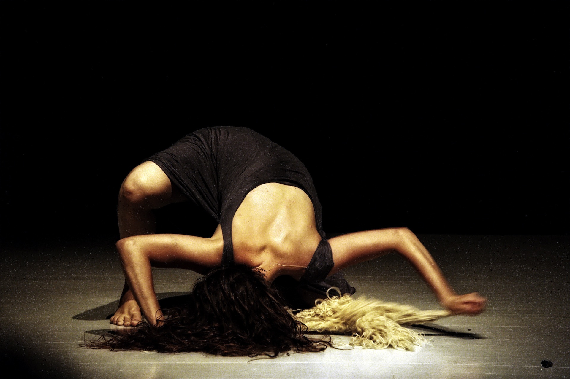Μ.Γ. Όταν έκανα το Μάστερ μου στο Πανεπιστήμιο, δούλεψα πάνω στους συμβολιστές του 19ιυ αιώνα, κι έπεσα πάνω στα γραπτά του Μαίτερλινγκ, και με ενδιέφερε πολύ η ποιητική της υπονόησης κι όλη αυτή η θεματική του, όπου υπάρχουν δύο ανταγωνιστικοί κόσμοι, κι ο συμβολισμός του, πάντα ήθελα να το μεταφέρω αυτό σε σκηνική πράξη. Η αρχική ιδέα ήταν αυτή, και πρώτα έγραψα ένα θεατρικό κείμενο πάνω σε αυτό το θέμα, κι άρχισα να το δουλεύω σε κίνηση με μια ηθοποιό. Και μετά σιγά-σιγά, από αυτό το συμβολιστικό έργο, το εμπνευσμένο από τον Μαίτερλινγκ, από πολύ βαθιά ήρθε ο μύθος της Αράχνης, αυτής της γυναίκας που είναι εγκλωβισμένη κάπου, σε ένα στενό χώρο, κι είναι ανάμεσα στο ζώο και τη γυναίκα. κι αφού ξεπρόβαλε ο μύθος, θέλησα να τον αναμορφώσω, κι αυτή την τιμωρία που έχει επιβληθεί στην Αράχνη στο μύθο, να τη δω με καινούριο τρόπο.