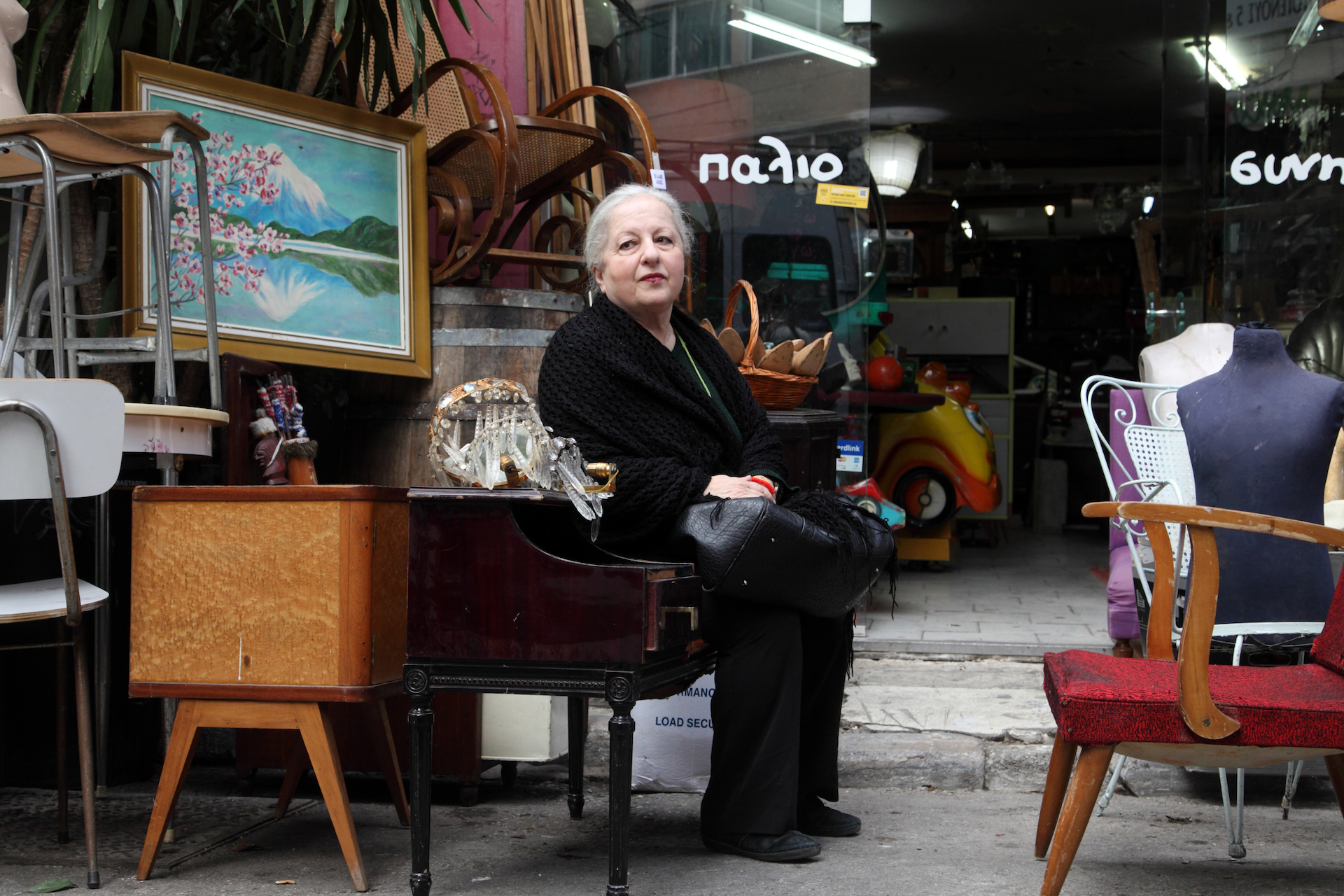 Το να περπατάς με την Ελένη Γερασιμίδου στο κέντρο της Αθήνας δεν είναι απλή ιστορία. Ταξιτζήδες σταματάνε και της φωνάζουν να την πάνε όπου θέλει. Γυναίκες την αγκαλιάζουν και της λένε πόσο την αγαπούν, κρατώντας την σφικτά, σχεδόν βουρκωμένες στην αγκαλιά τους . Καταστηματάρχες πετάγονται σαν τα ελατήρια έξω απ’ τα μαγαζιά τους για να τη χαιρετίσουν. Μπαίνουμε σε ένα ελληνικό υποδηματοποιείο στου Ψυρρή και κοιτάζει τα δερμάτινα γυναικεία υποδήματα των 25 και 30 ευρώ. «Δεν μπορούμε ούτε παπούτσια να πάρουμε σήμερα. Πού μας καταντήσαμε!», σχολιάζει.