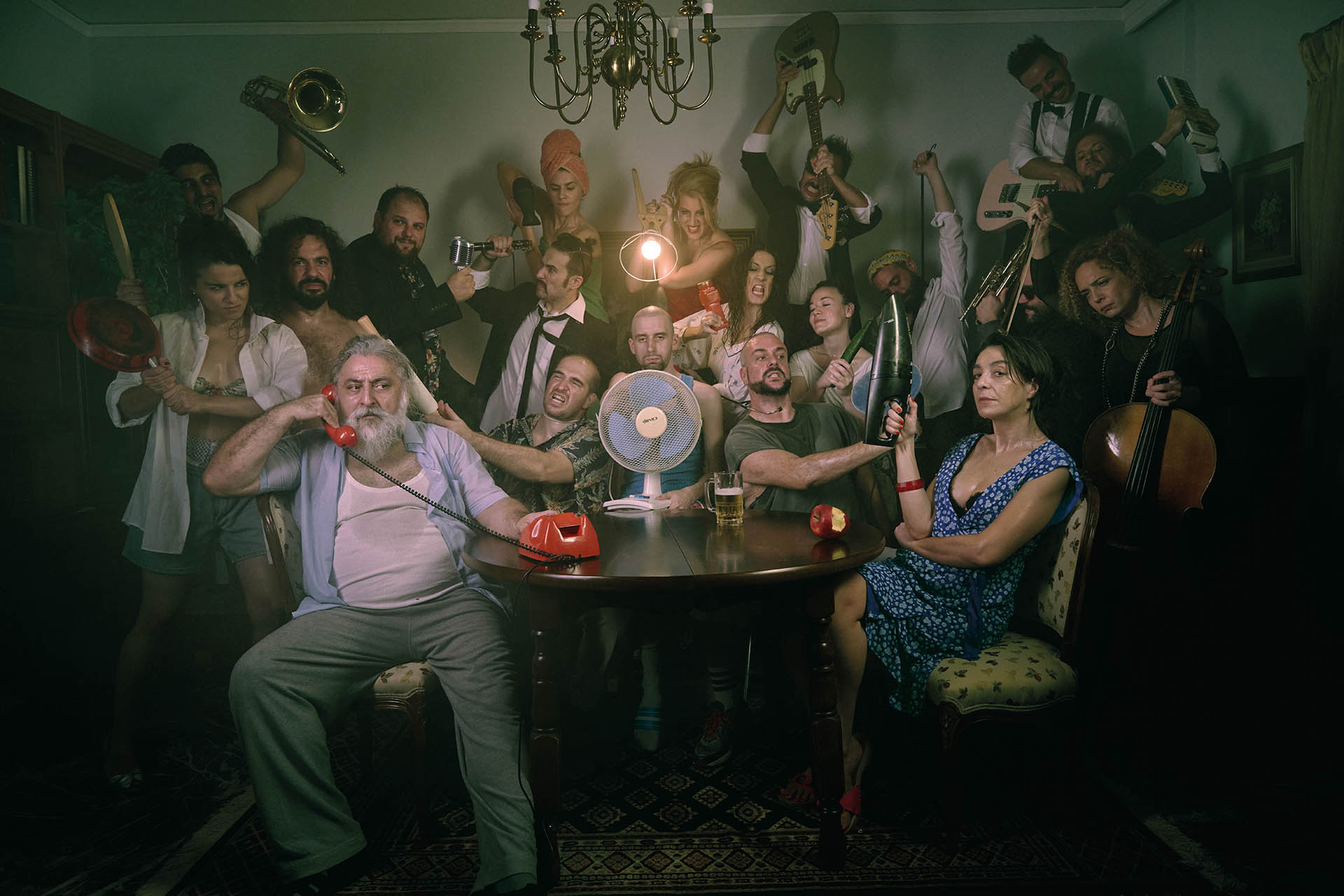 Όλα μοιάζουν με σουρεάλ σκηνικό, μόνο που δεν είναι. Είναι μια συνηθισμένη μέρα μέσα στο πυρωμένο μικρό κουτί μιας πολυκατοικίας όπου ζει η «αγία ελληνική οικογένεια». Με τον πάτερ φαμίλια Δημήτρη να προσπαθεί να πείσει τους πάντες ότι είναι ο άντρας του σπιτιού επαναλαμβάνοντας σιχτιρίκια σε ατελείωτο κρεσέντο, τη σύζυγό του Μαρία να πετσοκόβει χωρίς έλεος, τον κουνιάδο του Γιώργο να προσπαθεί να σβήσει τη φωτιά ενώ στην πραγματικότητα την αναζωπυρώνει, τον σεξιστή γιό του Λουκά σε ντελιριακή χυδαιότητα, την κόρη του Κική να παθαίνει αμόκ οργής, τον συνεργάτη Βαγγέλη που πρέπει επιτέλους να απαντήσει τι θα κάνει με τη Λίντα και τους λοιπούς παρατρεχάμενους που μπαινοβγαίνουν.