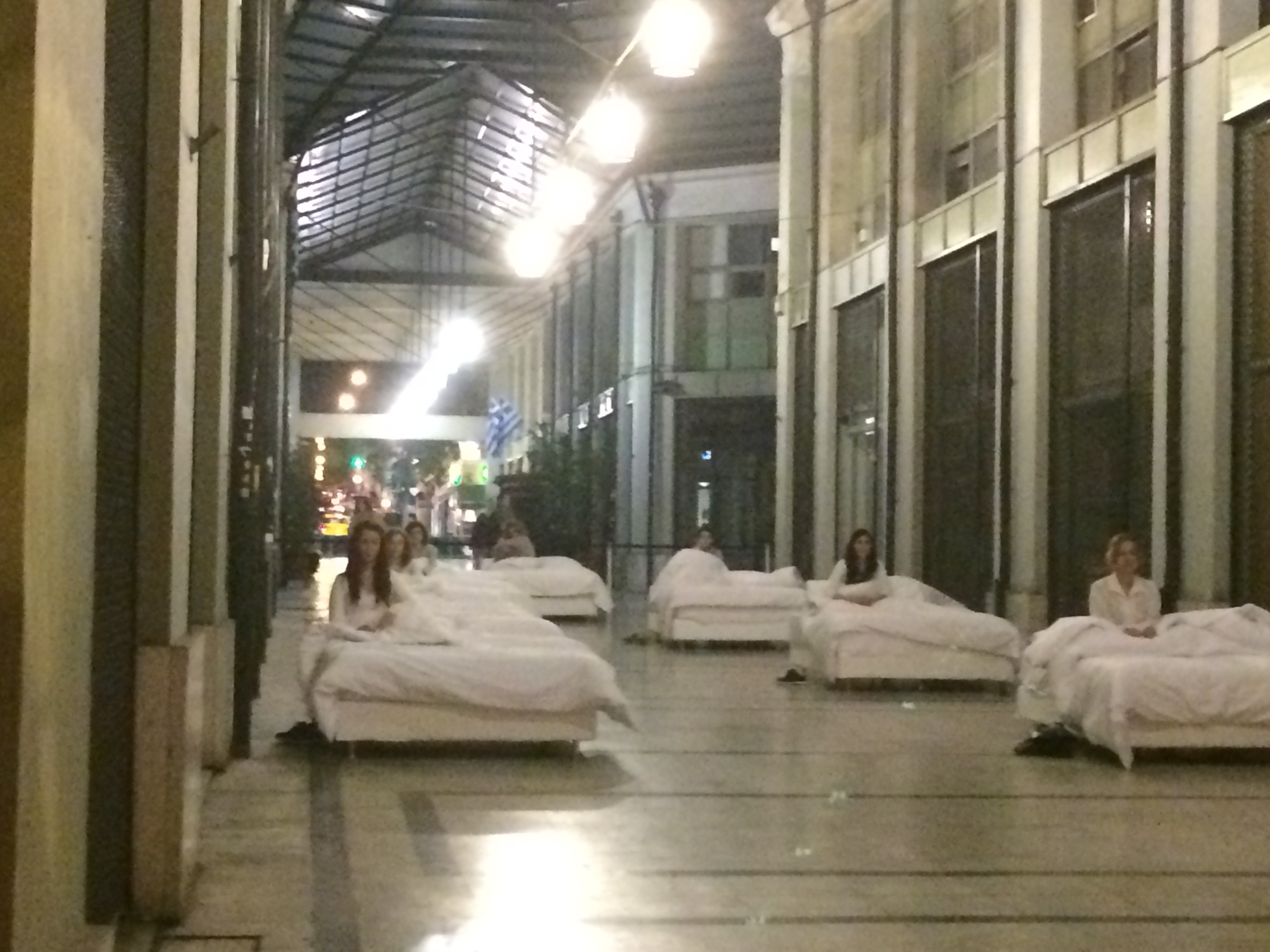 Τετάρτη 7.30 μ.μ στη Στοά Ορφέως μέσα στη Στοά του Βιβλίου. Καλή ώρα για να αράξεις σε ένα από τα επτά κρεβάτια που στήθηκαν για την παράσταση Όσα είναι δίπλα μου. Κάθε δεκαπέντε λεπτά ένα διαφορετικό γκρουπ επτά ατόμων ζει την εμπειρία του να ξαπλώσει. Το γκρουπάκι των επτά ατόμων ενημερώθηκε για την διαδικασία αλλά και την μοιρασιά των κρεβατιών.Τρία ζευγάρια διπλών κρεβατιών παρατεταγμένα δεξιά και αριστερά της κεντρικής στοάς και στην κορυφή άλλο ένα. Ήμουν ο τυχερός που ξάπλωσα στην κορυφή, μην έχοντας κάποιον άλλο θεατή κοντά μου σε άλλο κρεβάτι μην τυχόν και κόψω αντιδράσεις.