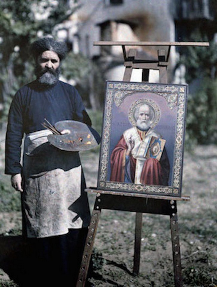 Ζωγράφος καλόγερος του Άθω δίπλα σε έργο του που απεικονίζει τον αγ. Νικόλαο