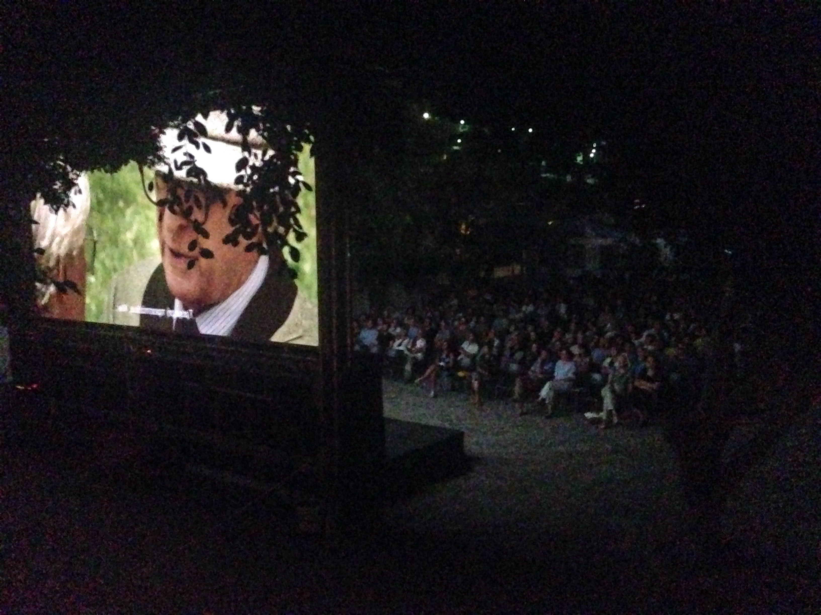 Στο παλιό δημοτικό σχολείο της Σκάλας, μόλις δέκα ανηφορικά βήματα πιο πάνω απ’ όλη τη βαβούρα του κοσμοφορτωμένου χωριού, η καταπράσινη αυλή με το δροσερό πλακόστρωτό της δάπεδο, έχει μεταμορφωθεί σ’ ένα φιλόξενο, αυτοσχέδιο σινεμά. Καθώς μαζεύεται ο κόσμος, καλοντυμένος και χαρούμενος, κι οι κοντά 300 θέσεις του γεμίζουν, ένας κικεώνας από γλώσσες, προφορές κι εκφράσεις γκελάρει στους τοίχους του σχολείου, όπως φαντάζεσαι ότι θα αντανακλούνταν κι οι φωνές απ’ τα παιδιά στο διάλειμμα στην προηγούμενη ζωή του χώρου.