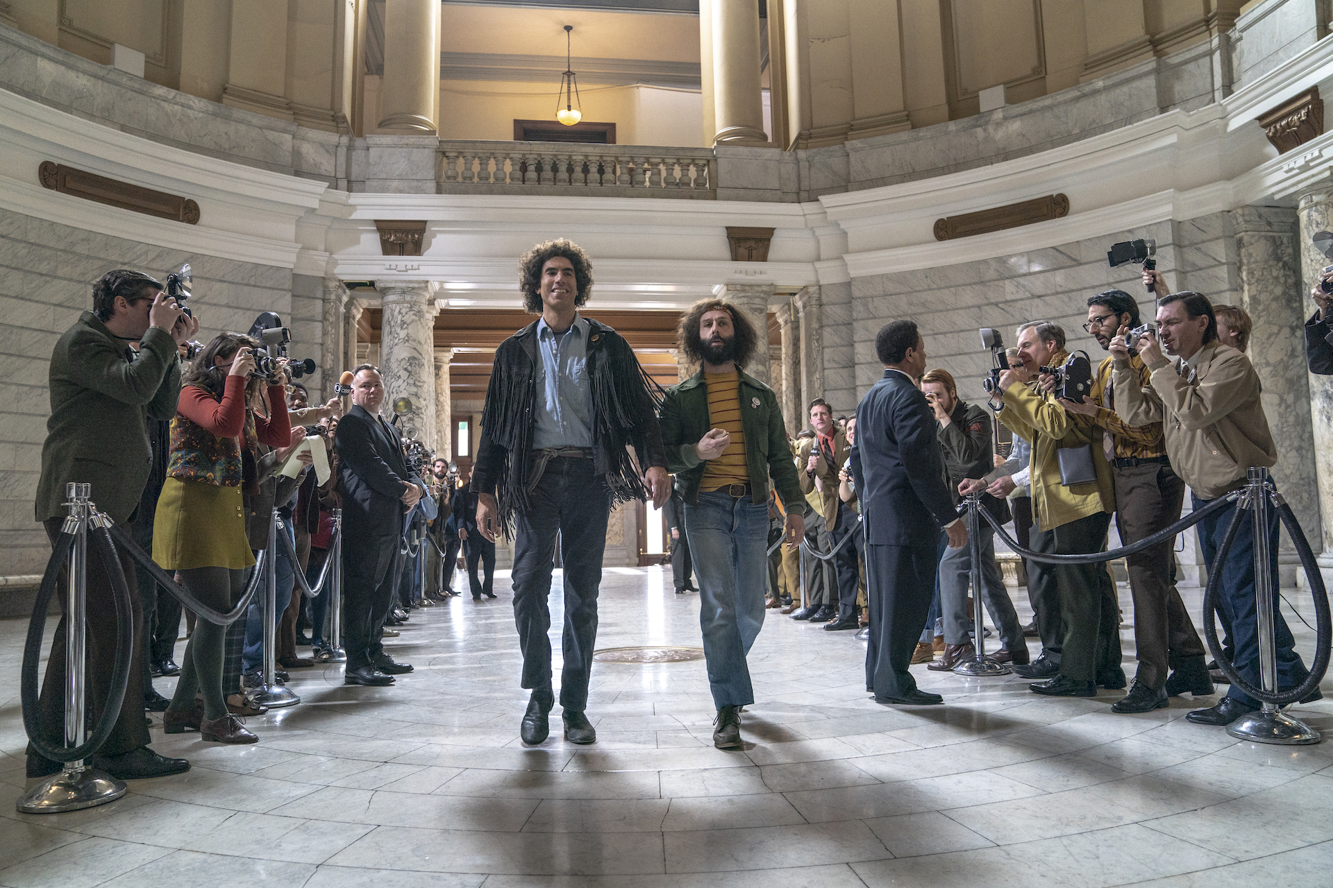 THE TRIAL OF THE CHICAGO 7 (L to R) SACHA BARON COHEN as Abbie Hoffman, JEREMY STRONG as Jerry Rubin in THE TRIAL OF THE CHICAGO 7. Cr. NIKO TAVERNISE/NETFLIX © 2020
