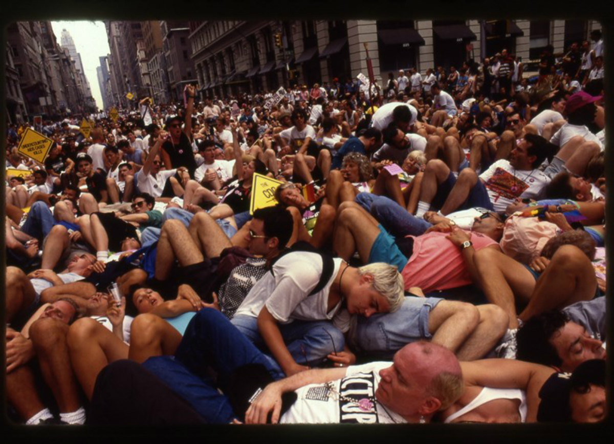Οι συμμετέχοντες της συμμαχίας ACT UP προσποιούνται τους νεκρούς στην Pride παρέλαση της ΛΟΑΤΚΙ κοινότητας στην 5η Λεωφόρο. Ιούνιος, 1991. Φωτογραφία: Donna Binder.