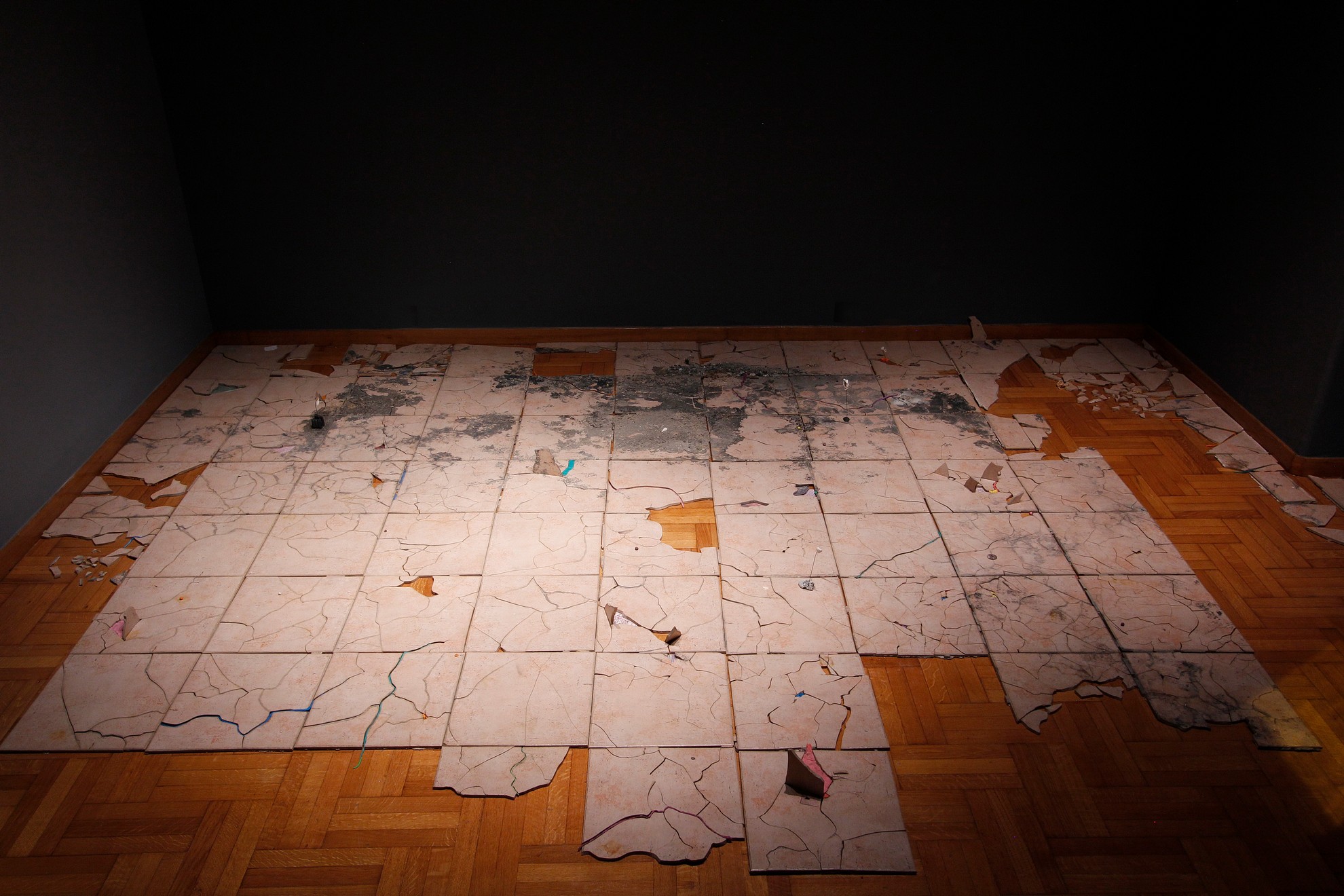Το συγκεκριμένο έργο το ολοκλήρωσα στο παιδικό μου δωμάτιο, πήρα το πάτωμα που βρήκα στο σπίτι της γιαγιάς Εσμέ στο Μάτι, σπασμένο και φθαρμένο και η συναρμολόγηση έγινε και λίγο σαν παιχνίδι παζλ. Διατήρησα όλη την καταστροφή και η δική μου επέμβαση με κάποιες πλαστελίνες και φωτογραφίες έγινε για να δώσω έμφαση στις ρωγμές που επήλθαν είτε από την καταστροφή, είτε από τον χρόνο, ενώ τα κενά σημεία έμειναν για να τονίσω με κάποιο τρόπο την απουσία. Η πλαστελίνη, ως υλικό, παραπέμπει στην παιδική ηλικία, κατά την οποία ένιωθα έντονα την απουσία της γιαγιάς μου, και είναι επίσης ένα υλικό που πλάθεται και ενσωματώνεται εύκολα, κάτι σαν τη φαντασία που τρυπώνει μέσα στα ερείπια με αναφορές στην ιαπωνική τεχνική του kintsugi.