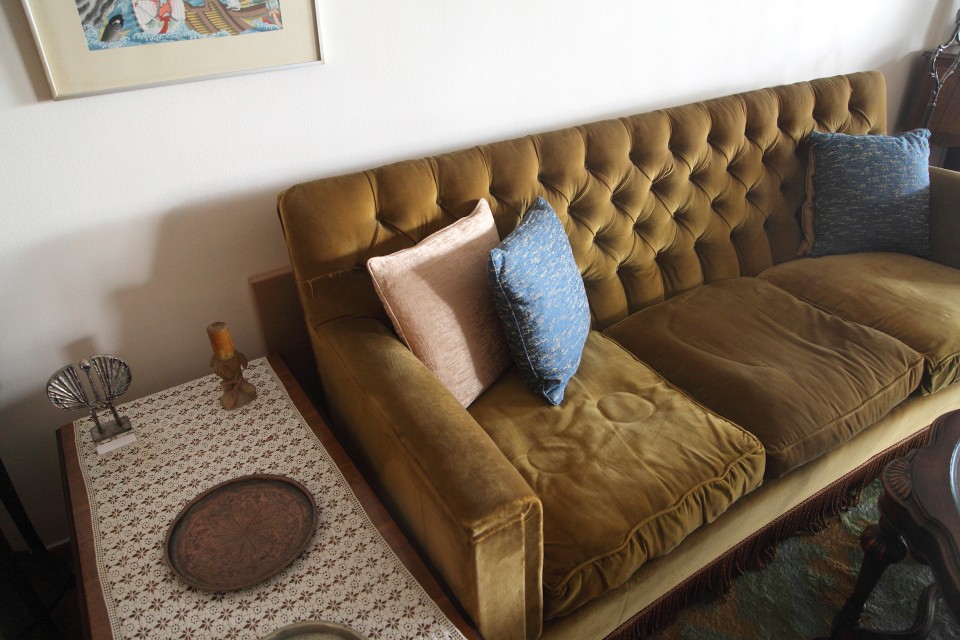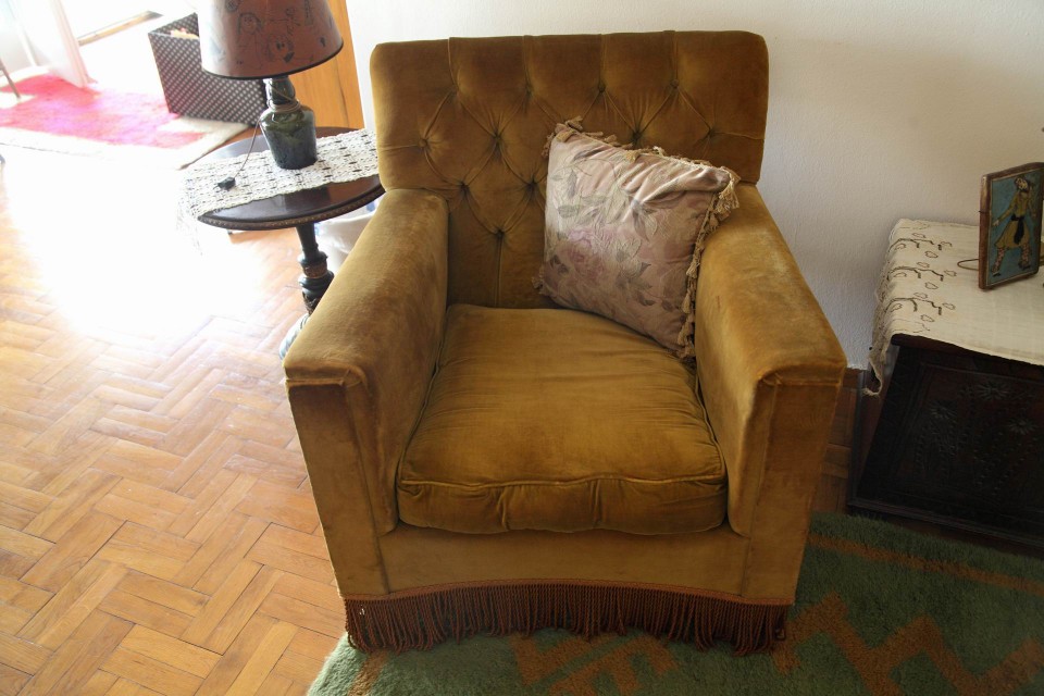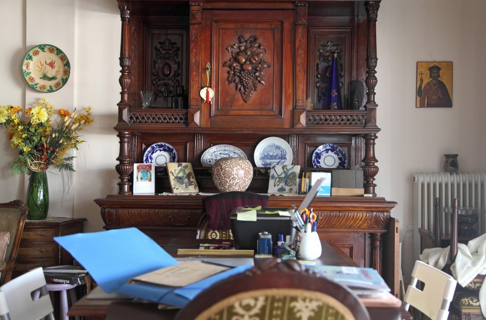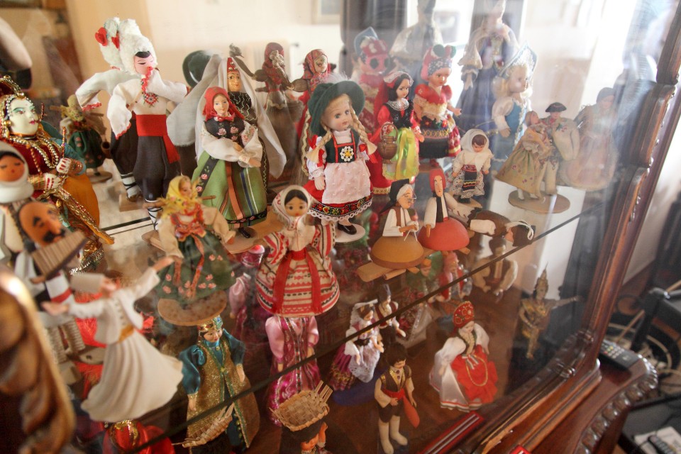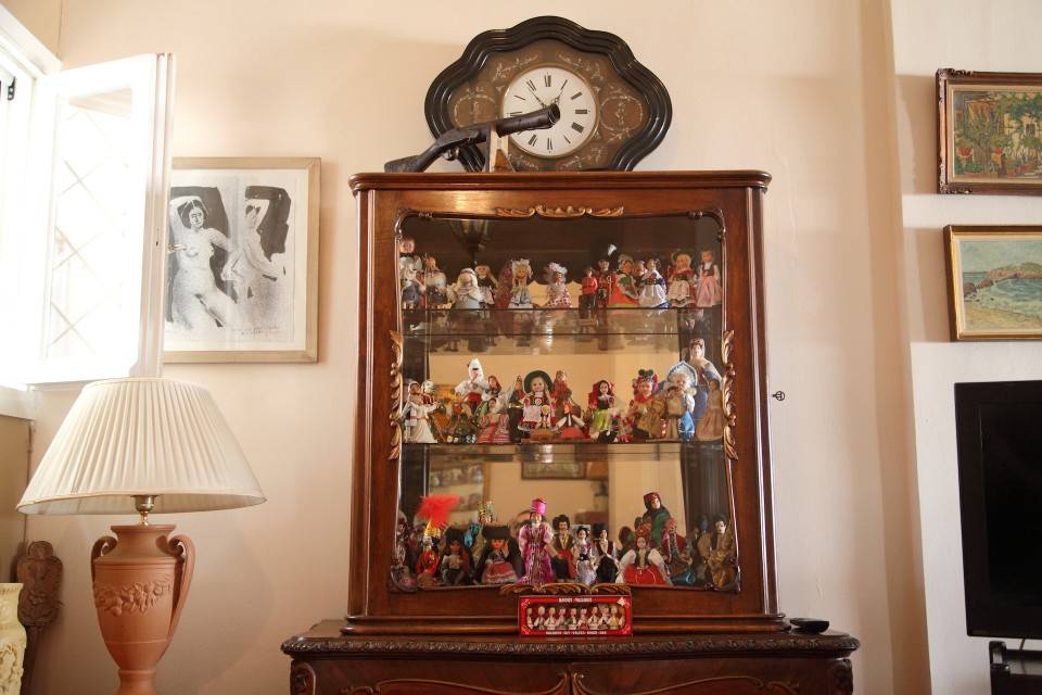 Παρατηρώ τα έπιπλα με τα οποία έζησε ένα μεγάλο μέρος της ζωής του ο ευγενέστερος κύριος του ελληνικού θεάτρου. Προσπαθώ να τον φανταστώ να κινείται και να δημιουργεί ανάμεσά τους. «Ο μπαμπάς μου πάντα καθόταν σε αυτό τον καναπέ και η μαμά μου σε αυτή την πολυθρόνα. Κι εγώ περιφερόμουν. Το χωλ ήταν ο πιο ζωντανός χώρος. Εδώ μαζευόμασταν κι οι τρεις». Στη βιτρίνα είναι παραταγμένες μέχρι ασφυξίας δεκάδες κουκλίτσες με εθνικές φορεσιές από ταξίδια του ζευγαριού στο εξωτερικό. Αντίστοιχη συλλογή έχω δει μόνο στο σπίτι του Χρόνη Αηδονίδη.