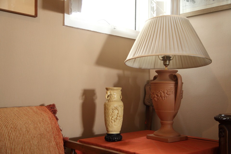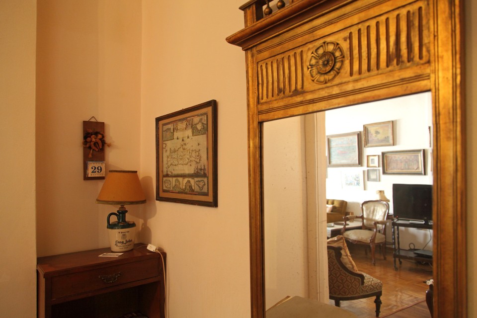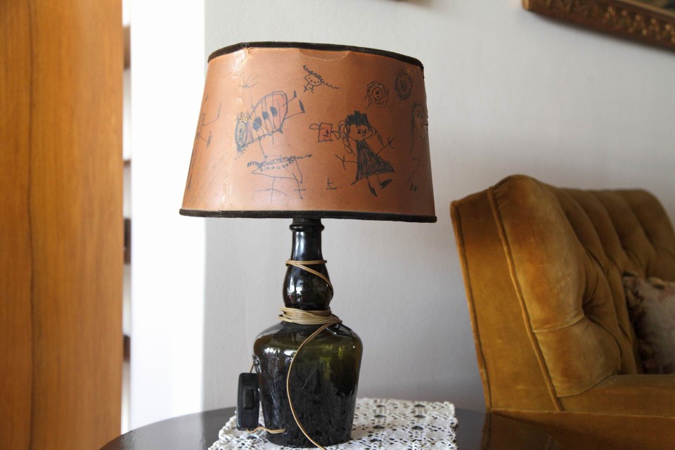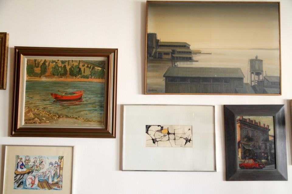 «Σε αυτή τη βιτρίνα, όσο ζούσαν, υπήρχαν κειμήλια δικά του που πήρα σπίτι, και παλιά βιβλία, τα οποία μεταφέρθηκαν στο μουσείο Ιάκωβος Καμπανέλλης στη Νάξο, που εγκαινιάστηκε πρόσφατα». Το ρολόι στον τοίχο ήταν μέρος του σκηνικού στο φιλμ «Το κανόνι και το αηδόνι» (1968), όπου ο Ιάκωβος Καμπανέλλης υποδυόταν ένα ρολογά – υπέγραφε το σενάριο κι ο αδελφός του Γιώργος τη σκηνοθεσία. Ένας πίνακας του Στάθη Λιβάνη συνομιλεί με το έργο του Μιχάλη Κατζουράκη, με τον οποίο «είχαν συνεργαστεί στη διαφημιστική εταιρεία που δούλευε ο πατέρας μου ως κειμενογράφος την εποχή της Χούντας».