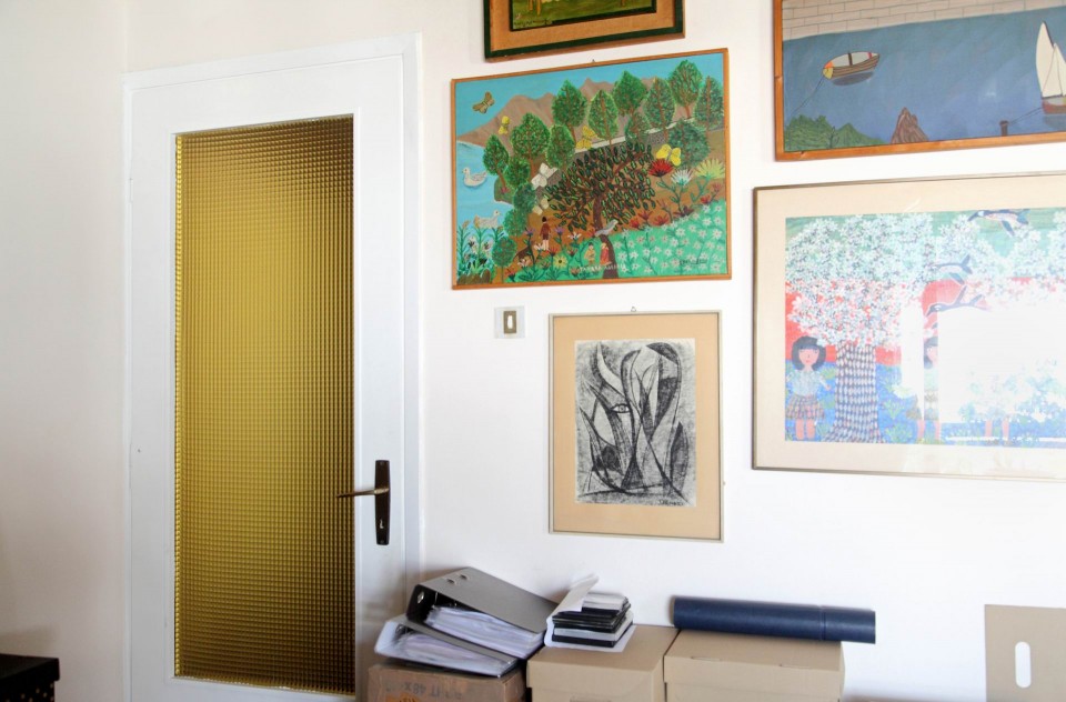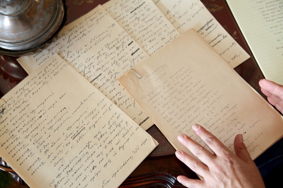 Τα έπιπλα του γραφείου του μαζί με τη βιβλιοθήκη του έχουν ταξιδέψει στο Μουσείο στη Νάξο. Στους τοίχους όμως παραμένουν κρεμασμένα σκίτσα του Κυρ και του Μητρόπουλου. «Τον θυμάμαι να κάθεται εδώ και να γράφει. Περνούσε πολλές ώρες, μέρες και νύχτες στο γραφείο του. Μπορεί κάτι να σκεφτόταν ακόμα και στον ύπνο του και να σηκωνόταν για να το σημειώσει. Έγραφε κι εμείς έπρεπε να είμαστε ήσυχες».