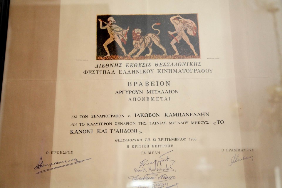 Ένα σπίτι γεμάτο μνήμες. Η συναισθηματική φόρτιση χτυπάει κόκκινο όμως όταν συναντάς τυχαία τα χειρόγραφα του Καμπανέλλη πάνω από το παλιό μπαράκι, εκεί που κάποτε υπήρχε το τζιν (τζιν με τόνικ ήταν το αγαπημένο του ποτό) και το Campari (το ποτό της συζύγου του). Ήτανε καλλιγράφος και φαίνεται πως είχε αποκλειστική προτίμηση στο μαύρο μελάνι – δεν υπάρχει χειρόγραφο με μπλε στυλό. Σε άλλα όμως έπιπλα στο χώρο φυλλάσσονται ταξινομημένα όλα του τα χειρόγραφα, ανάμεσά τους και η επίσης πρόσφατη ανακάλυψη με τον τίτλο «Αυτοκτονία», που αυτό τον καιρό περνά η Κατερίνα στον υπολογιστή.