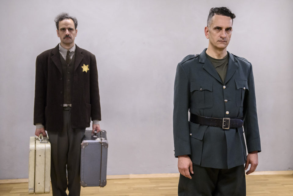 Κι αμέσως μετά μεταφερόμαστε στο τότε. Σ’ έναν άδειο τοπίο, με μόνα σκηνικά μια στοίβα βαλίτσες, κάθε χρώματος και μεγέθους, εμφανίζεται ένας άνθρωπος που μοιάζει κανονικός, οικείος, φιλικός, μέχρι τη στιγμή που ντύνεται τα ρούχα του Γερμανού αξιωματικού (Νίκος Ψαρράς). Βγάζει μία μία τις βαλίτσες από τη στοίβα και τις βάζει στη σειρά. Οι βάλιτσες-άνθρωποι, οι ξεριζωμένοι, αυτοί που ταξιδεύουν για κάπου που δεν γνωρίζουν… Λίγο αργότερα έρχεται κι ένας άλλος άνθρωπος, που η διάθεσή του διακρίνεται καθαρά στους κυρτούς του ώμους. Φοράει το κίτρινο άστρο στο στήθος (Δημήτρης Παπανικολάου) και είναι ο «δήμαρχος» της ιστορίας. Κι από εκείνη τη στιγμή παρακολουθούμε το ακραίο κτίσιμο μιας προπαγανδιστικής εικόνας, την κυνική και αδυσώπητη γραφή του «σεναρίου» ενός ψεύδους, με αρωγό τα βίντεο που προβάλλονται -σαν κινηματογράφηση της πολύχρονης και κοπιαστικής πρόβας αυτής της ιδιότυπης θεατρικής παράστασης. Ο «δήμαρχος» εκβιάζεται, απειλείται όταν ο Γερμανός του αποσπά κάτι ακριβό που αποτυπώνεται σε μια μικρού μεγέθους βαλίτσα και παραπέμπει στο παιδί του. Ο Γερμανός αυτοσκηνοθετείται φυσικά, για το ρόλο του καλλιεργημένου, του ευαίσθητου, του αριστοκράτη σχεδόν (μπροστά στους εκπροσώπους).