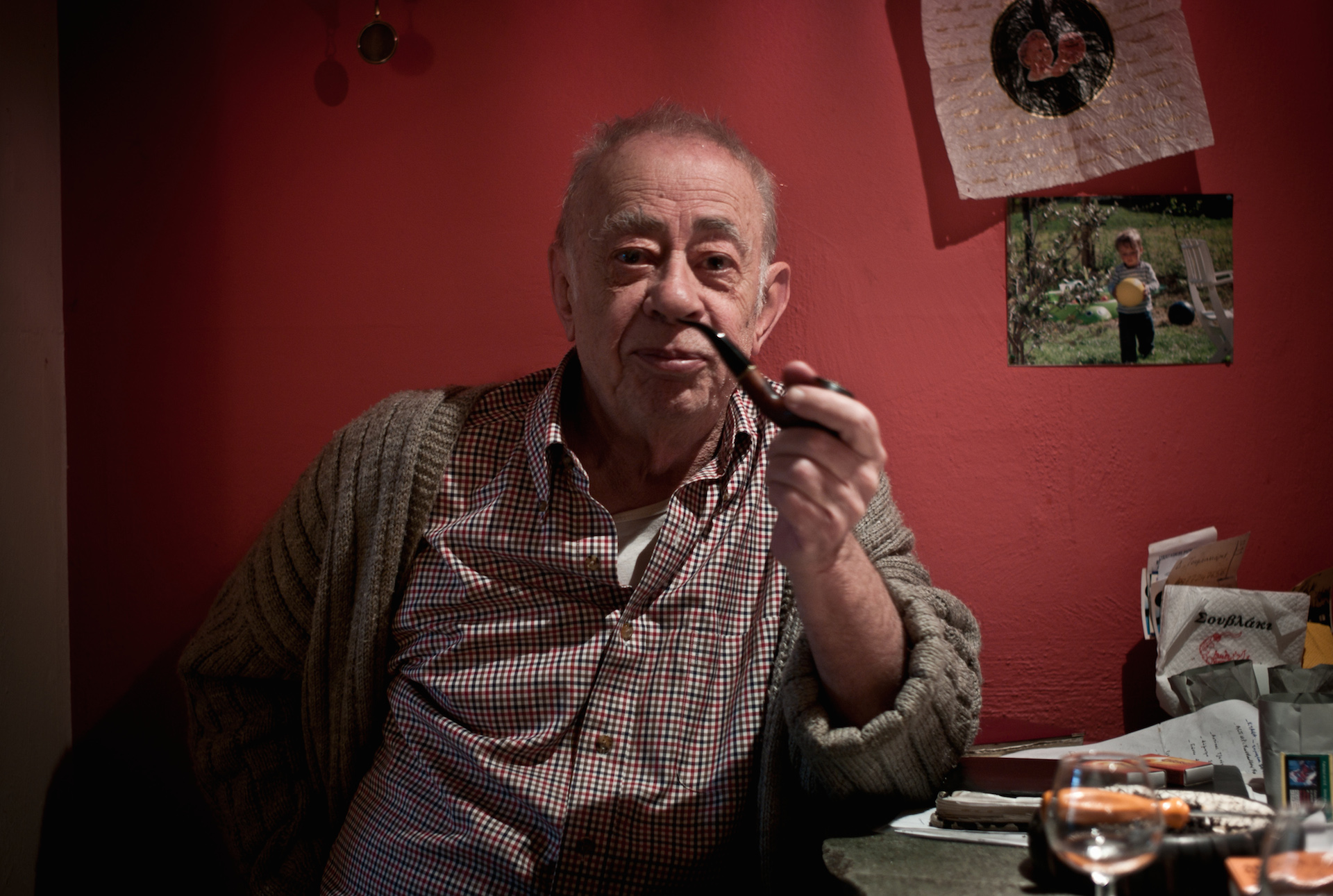 Περνώντας το κατώφλι του σπιτιού του -σε καλωσορίζει επιθετικά με ένα αυτοκόλλητο του ΣΥΡΙΖΑ- έχεις την αίσθηση ότι βρίσκεσαι χιλιόμετρα μακριά από το κέντρο της Αθήνας, σε μία μονοκατοικία στην εξοχή. Κι ενώ κερνά, για δοκιμή, τη μια ρακή μετά την άλλη («είναι απ’ τα νησιά μας»), αρχίζει να μιλά για τις ευθύνες της Δύσης για την τραγωδία στο Charlie Hebdo, την κτηνωδία της κυβέρνησης Σαμαρά και την Αθήνα που τον εμπνέει περισσότερο από το Παρίσι.