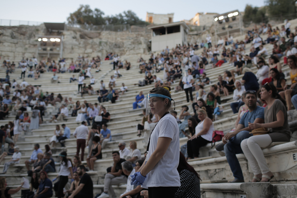Και είδαμε τις ταξιθέατριες με τις ολοπρόσωπες διάφανες μάσκες και με γάντια στα χέρια. Ανεβήκαμε στις θέσεις μας, που είχαν αποστάσεις από τους διπλανούς, χωρίς άλλους μπροστά μας ή πίσω μας, διαμορφωμένες ανά παρέες. Κοίταξα γύρω μου και ήταν μια διαφορετική, πρωτόγνωρη κατάσταση. Σε άλλες περιπτώσεις, άλλες χρονιές, θα λέγαμε «λίγο κόσμο έχει η εκδήλωση». Αλλά το Ηρώδειο την Τετάρτη είχε τόσο κόσμο όσον επέτρεπαν τα πρωτόκολλα: το 42% της χωρητικότητάς του, δηλαδή περίπου 2.000 άτομα.