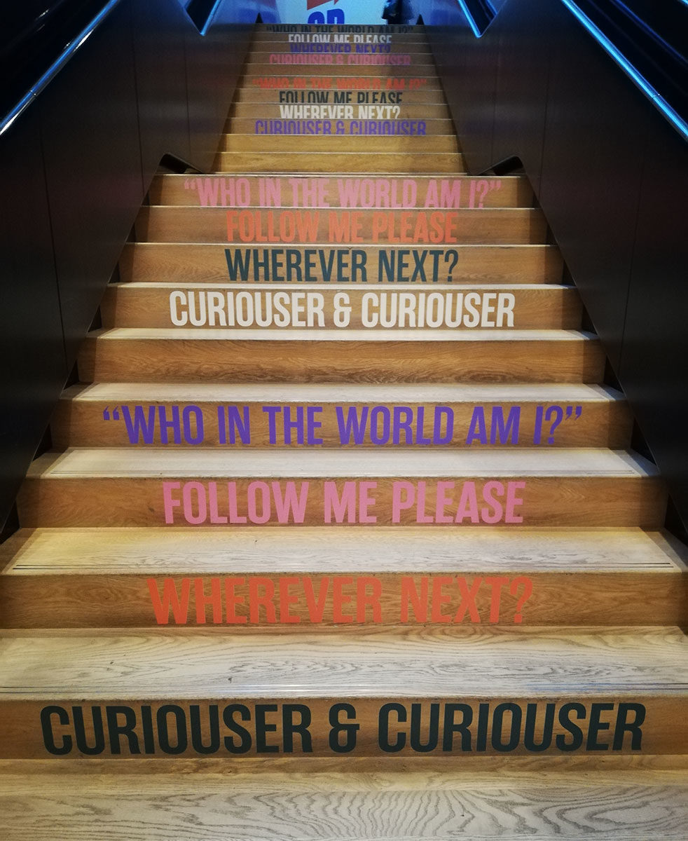 Πιο κάτω, μέσα από ψηφιακές ψυχεδελικές προβολές, ηχητικά εφέ και τα εντυπωσιακά σκηνικά του Tom Piper, οι επισκέπτες περνούν μέσα από δαιδαλώδεις διαδρόμους για να εξερευνήσουν τον πολιτιστικό αντίκτυπο της Αλίκης. Από τον τρόπο με τον οποίο ενέπνευσε τη δημιουργία αναμνηστικών αντικειμένων, μέχρι τις θεατρικές και κινηματογραφικές αποδόσεις της. Πόστερ ταινιών και παραστάσεων, φωτογραφίες της Alice Liddell, τσαγιέρες, ρολόγια, εφευρέσεις, όλα είναι εκεί και ιντριγκάρουν το μυαλό. Ένα πολύ σημαντικό στοιχείο είναι πώς η ανάπτυξη του κινηματογράφου τον 20ο και τον 21ο αιώνα, επέτρεψε στην Αλίκη να προσεγγίσει το παγκόσμιο κοινό, καθώς οι σκηνοθέτες μέσω της πρωτοποριακής τεχνολογίας CGI, των εφευρετικών σκηνικών και των εξωφρενικών κοστουμιών έδωσαν τις δικές τους ερμηνείες.