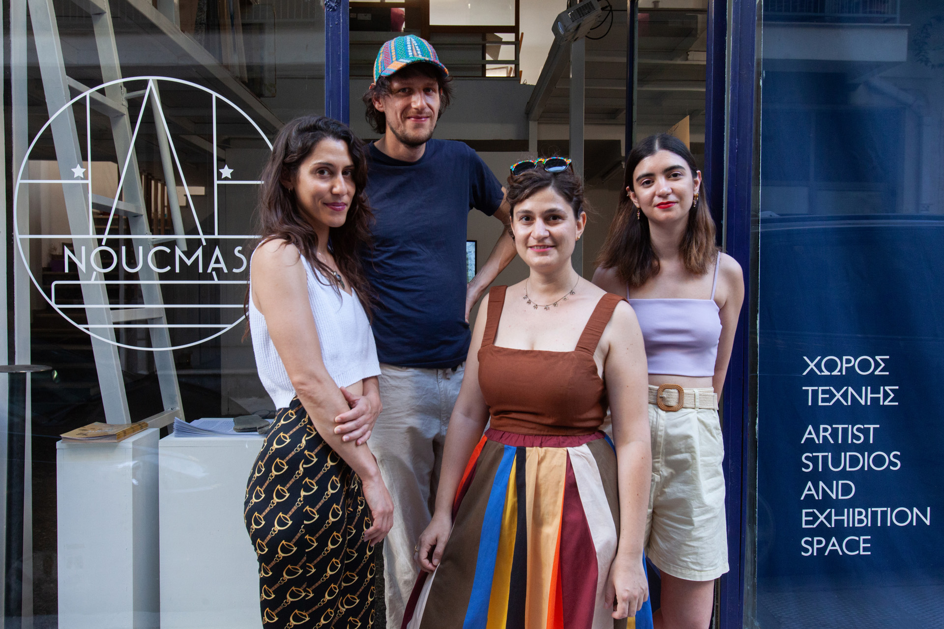 Ενώ συζητάμε με τον Μπενουά, καταφθάνει σύσσωμη η ομάδα Noucmas, μαζί με το νεότερο μέλος τους, την επίσης εικαστικό Κατερίνα Σαμαρά. Έχω ήδη υποστεί σοκ μαθαίνοντας ότι άφησαν το Παρίσι και το Λονδίνο για την Αθήνα των αλλεπάλληλων κρίσεων. Μάλιστα, και η Κατερίνα Σαμαρά επέστρεψε πρόσφατα από την Ελβετία!