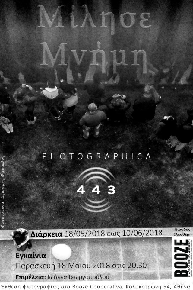 Εμπνευσμένη από τον τίτλο της αυτοβιογραφίας του σπουδαίου Ρώσου λογοτέχνη, η φωτογραφική έκθεση «Μίλησε μνήμη» παρουσιάζει την οπτική αυτοβιογραφία 17 φωτογράφων της ομάδας 443 Photographica στις 18 Μαΐου 2018, στο Booze Cooperativa.